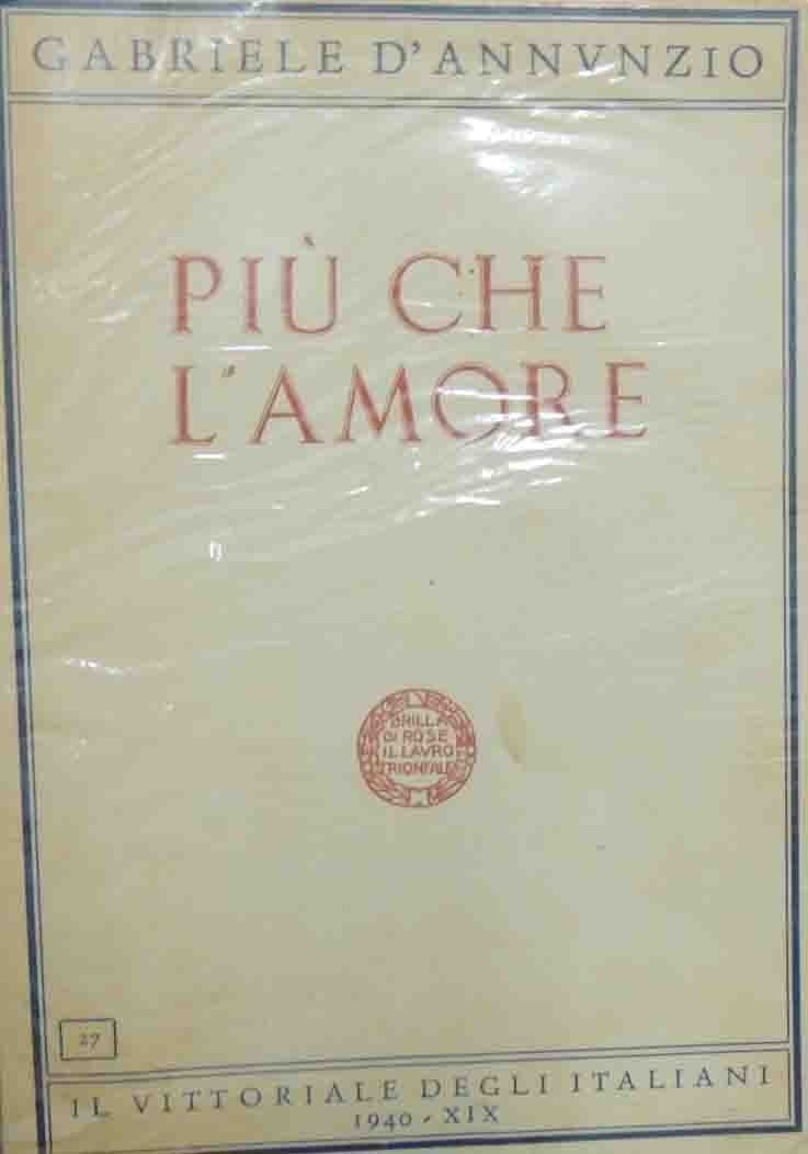 Gabriele D’Annunzio, Più che l’amore, Il Vittoriale degli Italiani, s.l. (ma stampato in Roma, presso le Officine dell’Istituto Poligrafico dello Stato) 1940, pp. 236, cm 23, br. ed. con sovraccoperta. Collana Tragedie, misteri e sogni, n. 27. Minime fioriture, per il resto perfetto. Intonso.