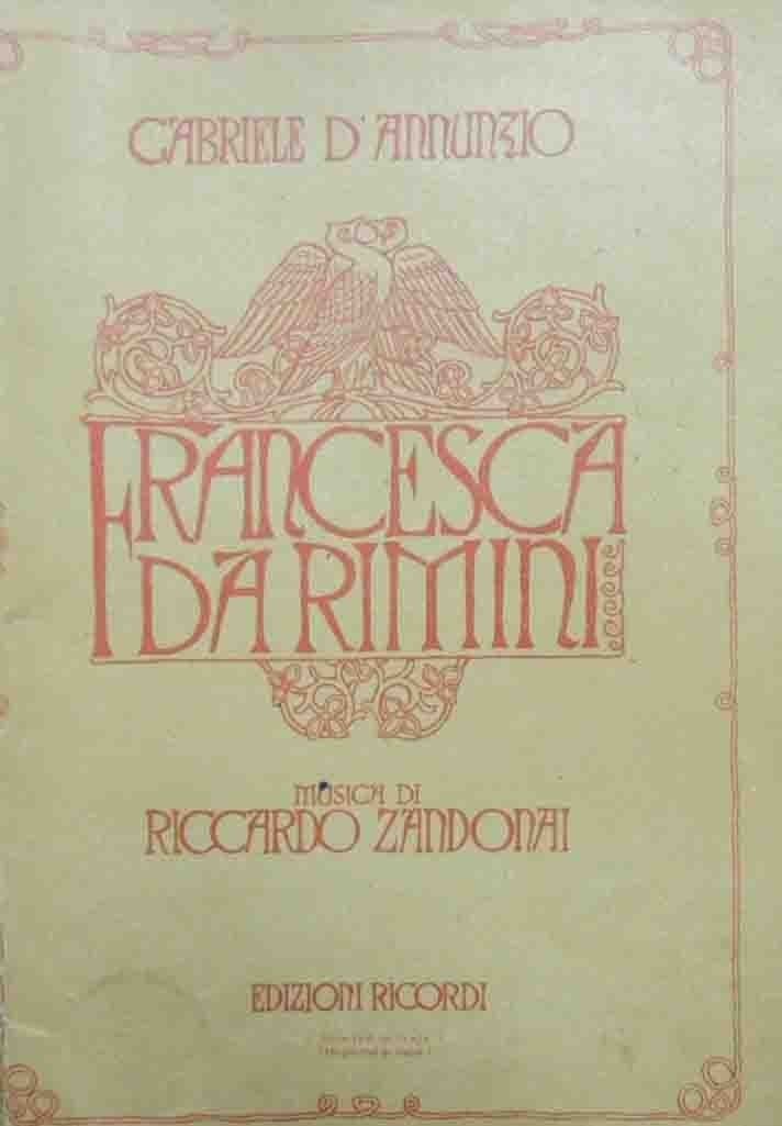 Francesca da Rimini. Tragedia in quattro atti di Gabriele D’Annunzio, ridotta da Tito Ricordi per la musica di Riccardo Zandonai, G. Ricordi e C., Milano 1914, pp. 74, testatine e finalini ill. b.n., cm 20, pubblicazione spillata. Timbro a secco dell’editore alla prima di copertina. Timbri prezzo alla quarta di copertina. Firma d’appartenenza al frontespizio. Una piccolissima mancanza alla copertina posteriore, minime fioriture, leggera brunitura della carta, per il resto ben conservato.