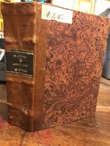 Marca tipografica incisa al frontespizio. Piccoli capilettera xilografici. Testo su due colonne. Leggera gora all'angolo sup. dx delle prime 10 carte, piccolo foro di di tarlo all'angolo inf. dx da pag. 267 a pag. 432. Qualche appunto manoscritto d'epoca, Bruniture ai tagli e a qualche pagina, ma buon esemplare. Pagg. 432 carte, 11 nn. Mezza pelle d'epoca ma successiva. Mis mm 205x105