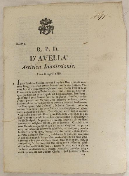 D'AVELLA ASSISIEN IMMISSIONIS LUNOE 6 APRIL. 1835