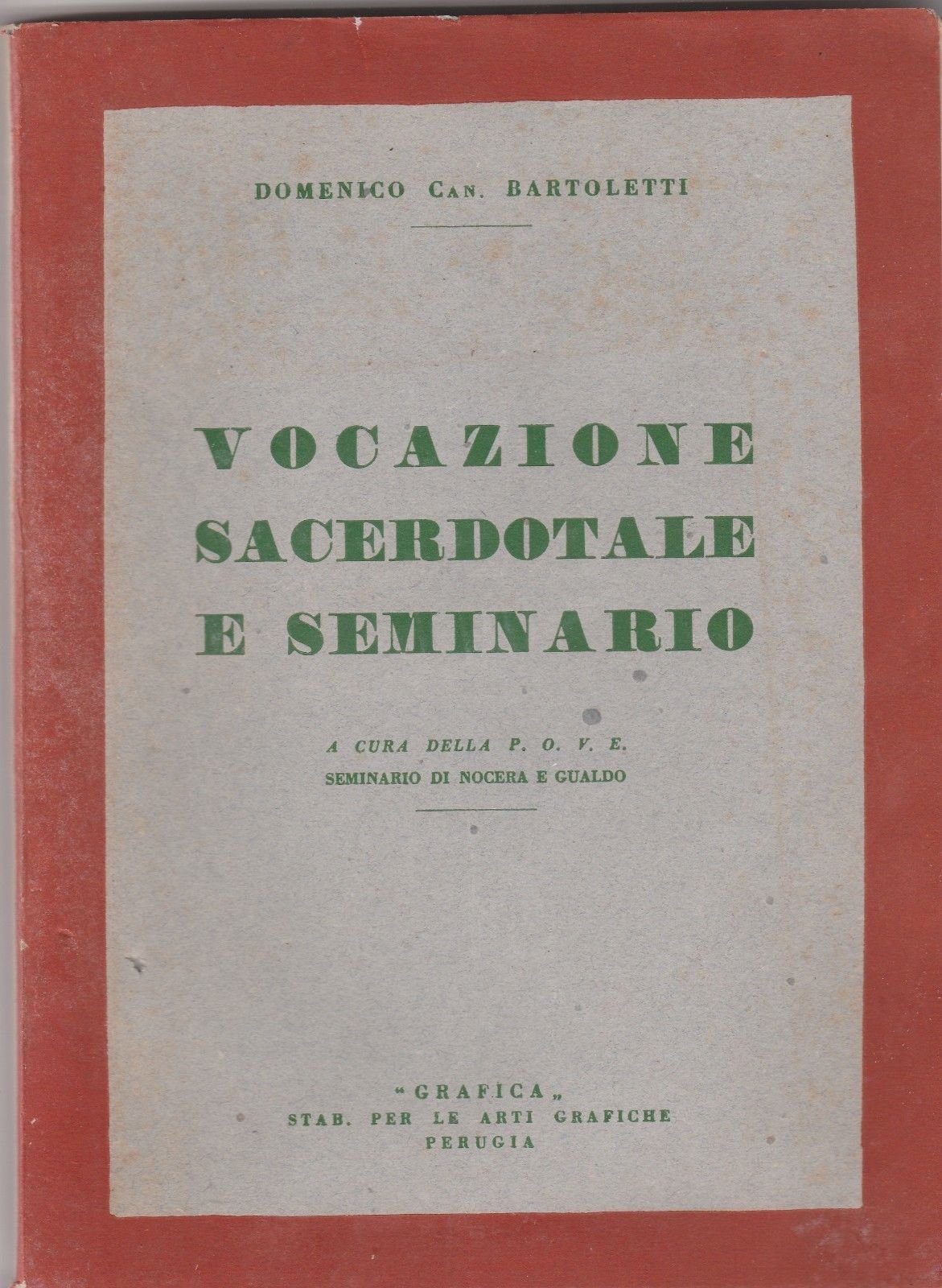 D. C. BARTOLETTI VOCAZIONE SACERDOTALE E SEMINARIO GRAFICA PERUGIA 1945 L3686 COPERTINA MORBIDA EDITORIALE CON LIEVI FIORITURE AL PIATTO ANTERIORE E LIEVI SPELLATURE AI MARGINI, AL FRONTESPIZIO DEDICA AUTOGRAFATA DELL'AUTORE E UNA LIEVE FIORITURA AL MARGINE INFERIORE, TAGLI IRREGOLARI CON QUALCHE FIORITURA, INTERNO IN BUONO STATO CON RARE FIORITURE INTERNE, N. PAG. 126 CM. 24 X 17
