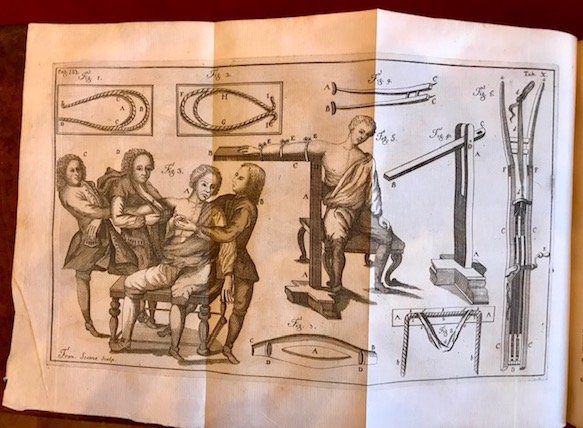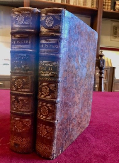 8vo (cm. 23,7), 4 Tomi legati in due voll., 8 cc.nn. (compreso ritratto dell’A. in antiporta e frontespizio stampato in rosso e nero), XLVIII-296 pp., 2 cc.nn. con 11 tavv. f.t. (di cui 10 ripiegate); 263(1) pp. con 10 tavv. ripiegate f.t.; 298 pp., 1 c.nn. con 12 tavv. ripiegate f.t.; 305(1) pp., 1 c.nn. con 6 tavv. ripiegate f.t. Il ritratto e le incisioni calcografiche sono opera di Francesco Sesoni. Capilettera e fregi xilografici n.t. Legature coeve in piena pelle con nervi, ricchi fregi e titoli oro su tasselli al ds. (minime imperfezioni). Tagli rossi. Pallido alone al margine superiore delle prime venti carte del terzo Tomo e lievi sporadiche arrossature. Nel complesso esemplare in ottimo stato di conservazione e completo di tutte le pregevoli tavole incise su rame. Non comune prima edizione napoletana di questo classico della letteratura medica che ha rappresentato il più popolare trattato di chirurgia pratica del XVIII Secolo durante il quale fu tradotto in tutte le principali lingue d’Europa. Garrison-Morton (5576): ‘Heister is the founder of scientific surgery in Germany. His book contains many interesting illustrations and includes an account of tourniquets used in his time’. Cfr. anche Blake, p. 204 e Wellcome III, p. 237.