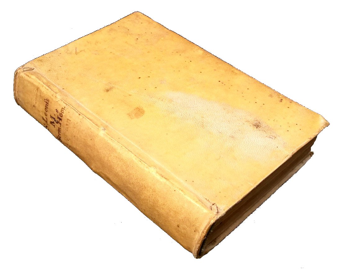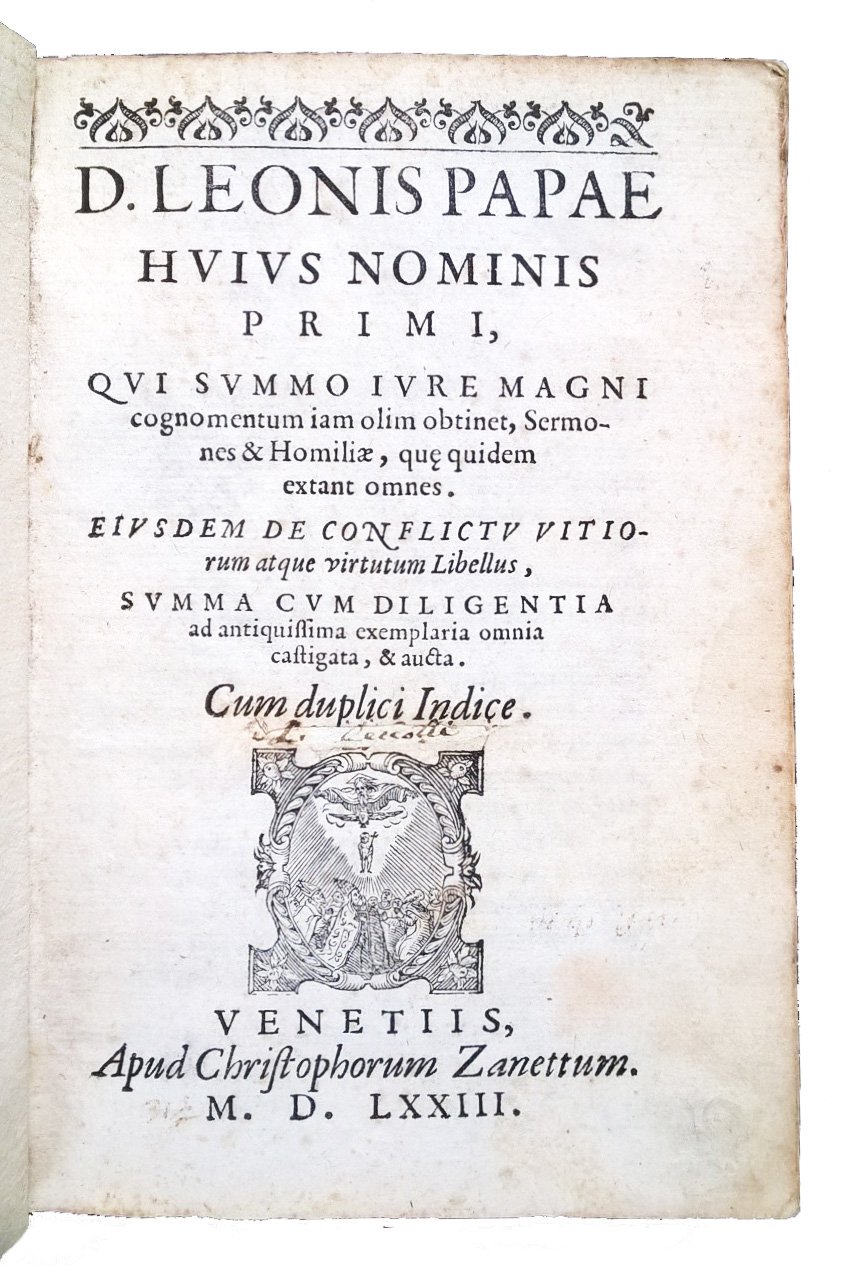 in-8°, 152x100 mm, leg. in piena pergamena, titolo manoscritto al dorso; [12], 240 c.; testatina e vignetta xilografica al frontespizio raffigurante Leone Magno in mezzo ai fedeli. Testatine, finalini e capilettera xil. Bella edizione veneziana del 1573 con una raccolta di omelie e sermoni di Papa Leone I (morto nel 461), celebre per aver cacciato Attila dall'Italia; comprende una parte dedicata alla vita di Papa Leone I, con riferimenti anche alle vicende legate ad Attila. Prov.: Indicazione d'appartenenza al frontespizio (L. Ceccotti). L. Ceccotti è stato un letterato e critico letterario viterbese, vissuto nella prima metà del 1800. Rif.: IT\ICCU\RMLE\000859. CNCE 38526. OCLC, 876465018. Cond.: Lievi tracce d'uso alla legatura. Antico restauro sul retro del frontespizio in corrispondenza di un vecchio piccolo foro orizzontale; sulla carta del restauro è apposta l'indicazione d'appartenenza risalente alla prima metà del 1800. Presenza di occasionali bruniture alle carte. Esemplare nel complesso molto buono. Peso: 285 g. -- A very good copy of a collection of homelies and sermons by the Pope Leone I , including the life of the Pope Leone I with refeerings to Attila and related happenings.