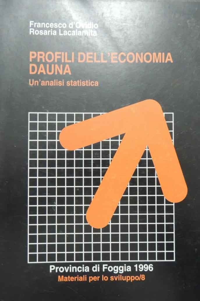 Francesco d’Ovidio, Rosaria Lacalamita, Profili dell’economia dauna. Un’analisi statistica, s.n., s.l. (ma stampato a Foggia, presso la Leone Editrice) 1997, pp. 149, cm 24, br. ed. In testa al frontespizio: Amministrazione Provinciale di Foggia. Collana Materiali per lo sviluppo, n. 8. Collana a cura dell’Ufficio Stampa dell’amministrazione Provinciale di Foggia. Alla prima carta, dedica manoscrtitta di uno degli auotri. Leggere tracce d’uso alla brossura, per il resto perfetto.
