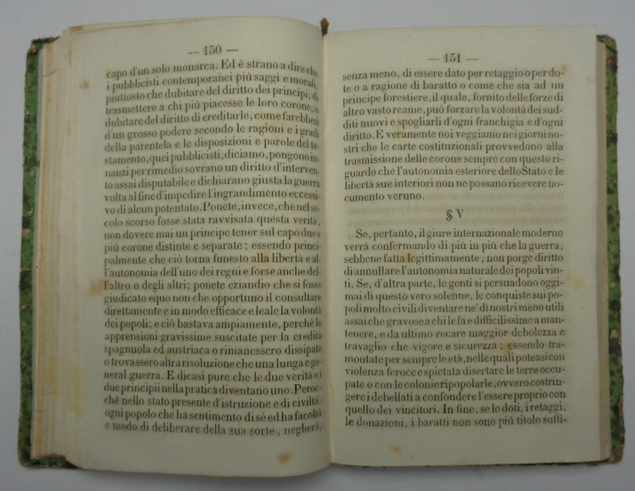 Un volume (18 cm) di VIII-383 pagine. Fioriture diffuse, in particolare alle prime e ultime pagine. Mezza tela coeva, dorso muto con abrasioni e un'etichetta; piatti con carta marmorizzata, ma nel complesso discrete condizioni.