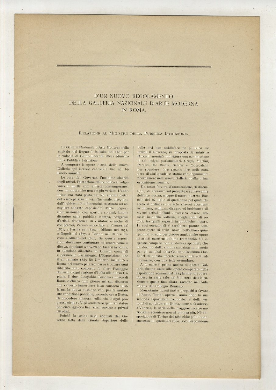 D'un nuovo regolamento della Galleria Nazionale d'Arte Moderna in Roma. Relazione al Ministro della Pubblica Istruzione.