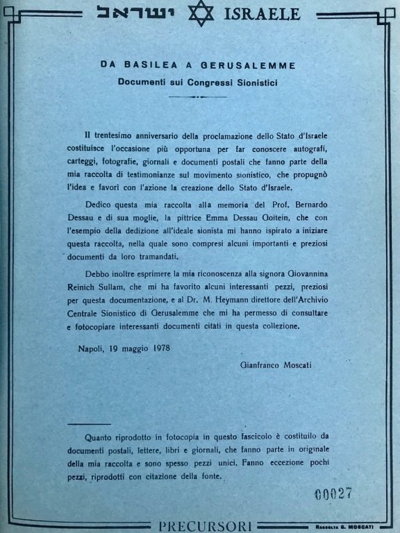 In-4° (cm. 31), brossura azzurra con titolo in nero al dorso, cc. 203 di riproduzioni documentarie sul sionismo, in pubblicazione a cura dell'autore (es. num. 27). Autografi, carteggi, fotografie, giornali e documenti postali della collezione relativa al movimento sionistico di Gianfranco Moscati: documenti di Theodor Herzl per uno Stato ebraico, documenti che precorrono una Palestina ebraica, documenti di congressi sionistici, movimenti sionistici in Italia e all'estero, personalità sioniste in Italia e all'estero. «Spesso pezzi unici» [p.1]. Esemplare molto buono. (ND4)