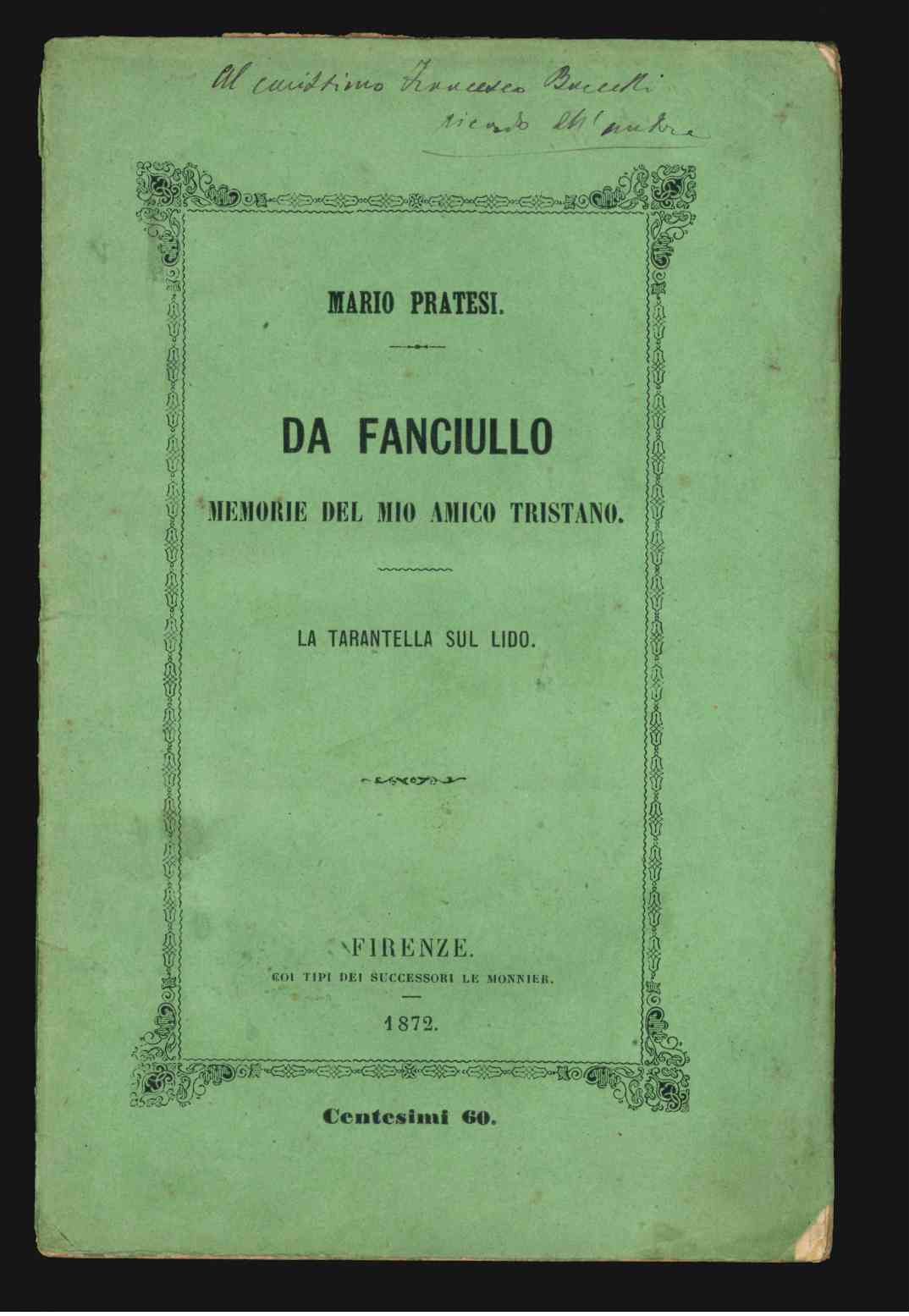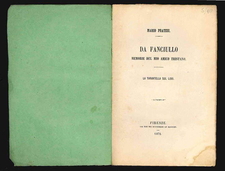 LIBROSeconda edizione con notevoli varianti.CON AUTOGRAFO.Ottimo esemplare in barbe. Invio autografo dell'autore.Le Memorie furono pubblicate per la prima volta nel giornale Il diritto nel 1870 e nello stesso anno in volume a Roma da Civilli col titolo La vita dell'infanzia: Memorie dell'amico Tristano.