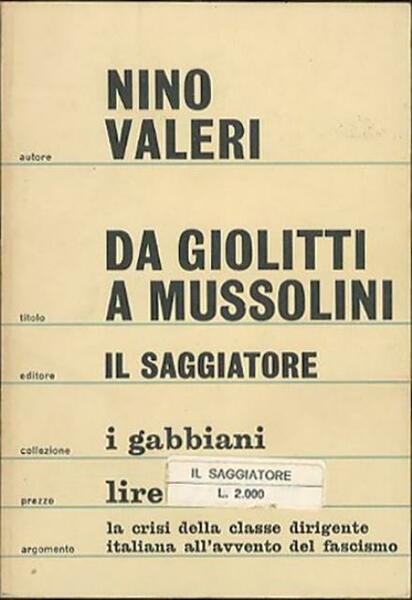 254 p. ; 17 x 11 cm. I Gabbiani, 51. L'opera evoca la crisi del mondo liberale davanti al fascismo, quale si accentrò nei personaggi più rappresentativi dei tempi: da Giolitti, che impersonò il dramma della vecchia Italia a partire dalla guerra mondiale, a D'Annunzio, colto come annunciatore e artefice di una nuova politica destinata a trionfare con Mussolini, a Facta, rappresentato quale consapevole strumento di una fatalità storica. Sullo sfondo è disegnata la folla degli altri personaggi, sospinti, essi pure, dalla medesima corrente. Il volume si chiude con Croce e Gobetti, in quanto annunciatori, ciascuno nel suo stile, di un rinnovato liberalismo. Brossura editoriale, coperta in cartoncino flessibile colorato con titolo impresso in nero al piatto e al dorso. Codice libreria 7527.