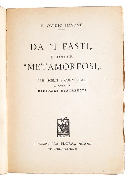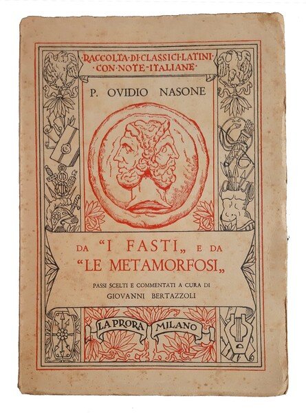 in-8° ( 20,5 x 14,5 cm); pp. 135, (4); leg. in brossura editoriale, con titolo in b/n al dorso, piatto ant. con titolo entro cornice molto decorata a colori rossi e neri con medaglione al centro di colore rosso con doppio volto, pubblicità editoriale al piatto post.; l'opera è composta da occhietto, front. in b/n con marca tipografica raffigurante la prua di una nave nei flutti, con il motto "fortiter in pelago", vita di Ovidio, i Fasti, le Metamorfosi, indice; alcune illustrazioni b/n f.t. (8 tav. di fotoriproduzioni di incisioni); edizione facente parte della Raccolta di Classici Latini con note italiane. Rif.: IT\ICCU\CUB\0417149. Cond.: presenza di leggere tracce d'uso e piccole macchie, qualche annotazione a matita nel testo; opera in buone condizioni generali.