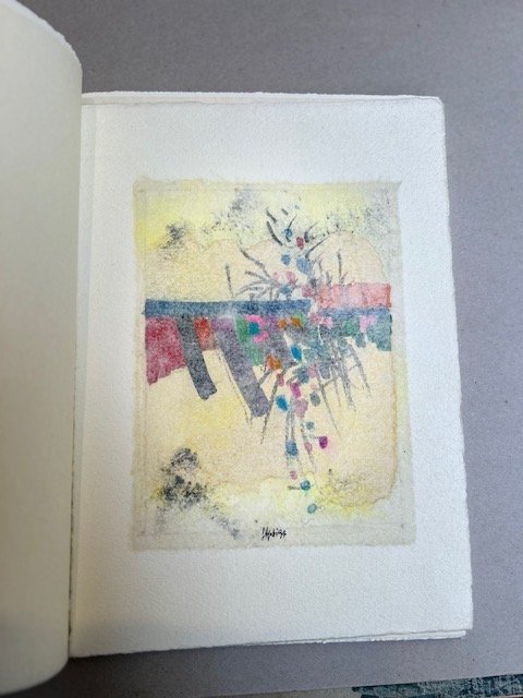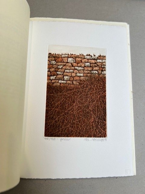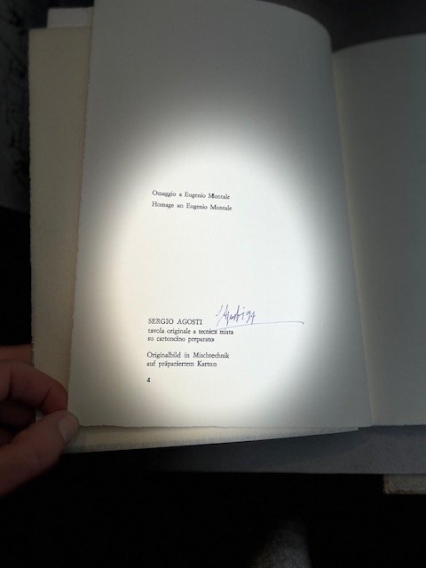 In-8° (252 x 175 mm.), pp. 45, 5 tavv. f.t., brossura editoriale muta con sovracc. in stampa calcografica a rilievo di Sergio Agosti. Tiratura di 125 esemplari numerati, il nostro è il n. 115. In dettaglio le tavole: Sergio Agosti tavola originale a tecnica mista - Verena Vernunft due acquatinte a colori - Mario Chianese due acquaforti, una in nero e una in sanguigna - Gianni Demo acquaforte in bianconero. Questa testimonianza-libro per Eugenio Montale è stata terminata di stampare nel mese di aprile 1994 presso la stamperia Rubatto di Pino Torinese, usando caratteri Garamond nei vari corpi dall'8 al 12, su carta Corolla Book Avorio delle cariere Fedrigoni. Sovraccoperta, tavola pittorica originale ed impaginazione sono state realizzate da Sergio Agosti.