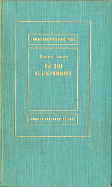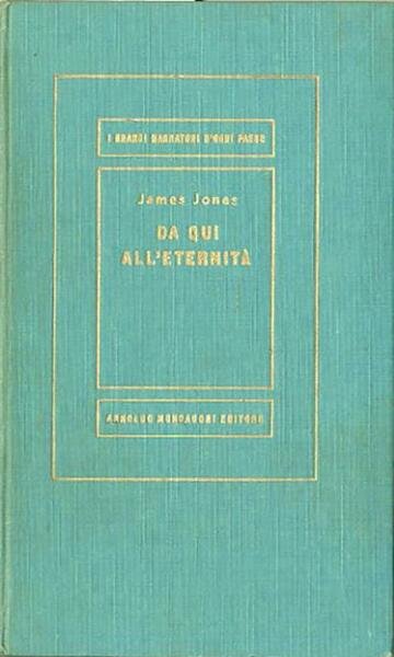 4. ed. 2 v. (1096 p.) ; 20 x 12 cm. Medusa, 326 */**. E' il primo romanzo dell'autore americano James Jones, vincitore del premio National Book Award nel 1952. Il romanzo trae spunto dall'esperienza di guerra dell'autore che fu soldato dal 1939 fino al 1945 e fu presente sia all'Attacco di Pearl Harbor che alla battaglia navale di Guadalcanal, dove fu ferito e decorato al valor militare. Titolo originale dell'opera: "From here to eternity". Unica traduzione autorizzata dall'americano di Glauco Cambon. Sulla cop.: I grandi narratori d'ogni paese. Legatura editoriale con coperta rigida in tela verde, titolo impresso in oro al dorso e al piatto. Pagine interne leggermente ingiallite del tempo, firma di appartenenza nell'occhietto, per il resto libro integro. Codice libreria 7749.