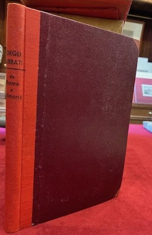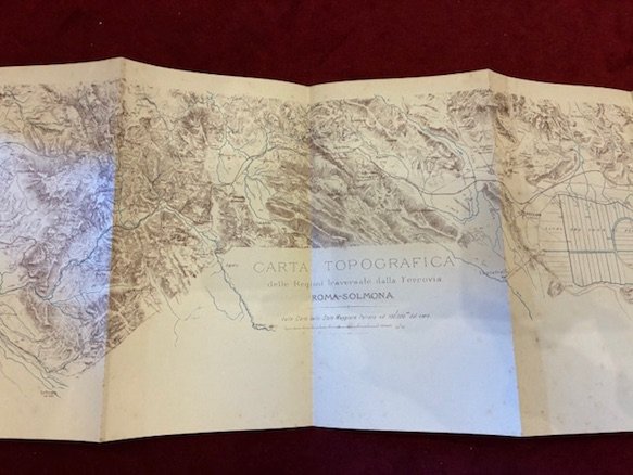 8vo (cm. 22), 4 cc.nn. (di cui l’ultima bianca), 181(1) pp., 2 cc.nn. Con num.se illustrazioni (di cui 16 su tavv. f.t.), 4 tabelle ripiegate ed una grande carta più volte ripiegata di cm. 80x22 al principio del volume (’Carta topografica delle Regioni traversate dalla Ferrovia Roma-Solmona’). Legatura ‘900 in mz. tela rossa con titolo stampato in nero al ds. Cop. editoriale anteriore conservata all’interno. Pagine ingiallite, altrimenti ottimo esemplare. Rara guida pubblicata nello stesso anno dell’inaugurazione di questa linea ferroviaria che collegò Roma agli Abruzzi.Provenienza: Collezione Spina, Avezzano (timbretti ex libris).