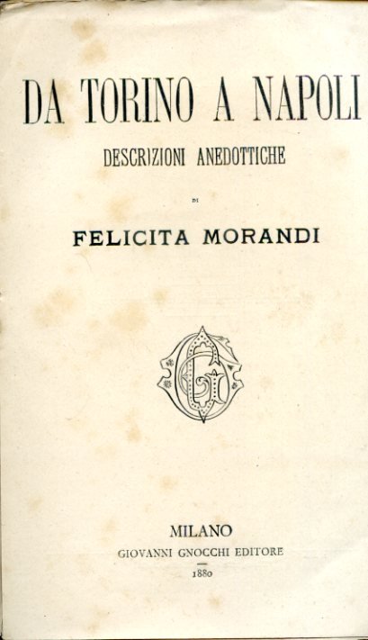 In-8°, pp. 462, brossura parzialmente originale (il dorso e il piatto posteriore sono editoriali, il piatto anteriore è rifatto). Testatine, capilettera e finalini ornati in xilografia. Numerosissime vedute xilografiche n.t. e f.t. relative all'intero territorio italiano da Torino a Napoli. Fioriture sparse. In barbe. Prima edizione di questo resoconto di viaggio in Italia steso in forma di lettere indirizzate da una fanciulla (in cui è adombrata l'autrice stessa), Gabriella, all'amica Maria. Le notazioni concernono, seguendo l'ordine dell'itinerario della Morandi, Torino, Genova, Pegli, Piacenza, Parma, Bologna, Roma, Napoli, il Vesuvio, Ercolano e Pompei, Caserta, Albano, Spoleto, Assisi, Firenze, Fiesole, Ravenna, Venezia, Padova, Vicenza, Verona, Milano. Per ogni località l'autrice indugia a lungo, con dovizia di aneddoti singolari e di informazioni circa le tradizioni, le leggende, i dialetti, le feste, l'economia, i monumenti, la cucina, etc. Felicita Morandi (Varese, 1827-Milano, 1905), poetessa e insegnante, pubblicò svariate commedie e raccolte di liriche con lo pseudonimo 'Una Lombarda', le prime delle quali pubblicò consigliata da scrittori suoi amici, tra cui il Fusinato e persino Ippolito Nievo. Fu direttrice di istituti femminili e di orfanatrofi e ispettrice delle scuole femminili dell'Italia settentrionale. Clerici, Viaggiatori italiani in Italia, n. 1002. Fossati Bellani, I, p. 236, n. 587 (terza edizione, del 1890, col titolo 'Un viaggio in Italia'). Teresa Bertillotti in D.B.I., LXXVI, 2012 (con bibliografia).