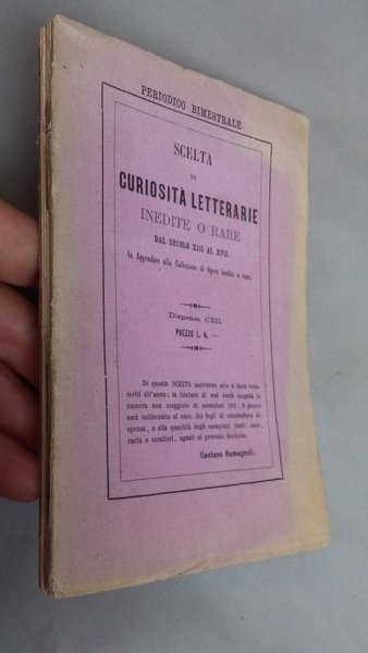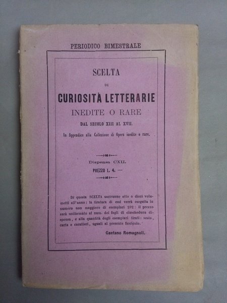In-8°; XXXI, 95 pp.; copertine editoriali a stampa (un poco slegato). Esemplare intonso. Racconto medievale di carattere esoterico e visionario edito in 202 copie numerate (questo il nr. 89) all'interno della "Scelta di curiosità letterarie inedite o rare".