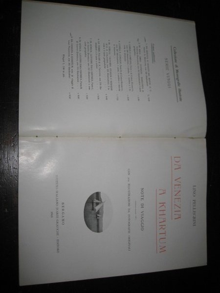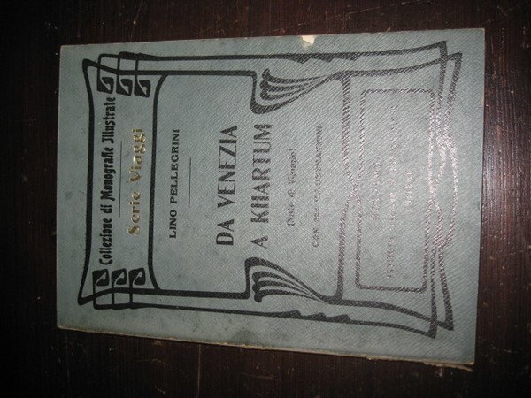 In-8°, pp. 169, cartonatura editoriale con titolo in oro e in nero entro bordura stilizzata in nero. 202 illustrazioni n.t. da fotografie originali. Buon esemplare impresso su carta patinata. Prima edizione di questo racconto di un viaggio dell'autore da Venezia sino all'Egitto e al Sudan, ricco di curiose notazioni. Collezione di Monografie illustrate. Serie Viaggi, 9.