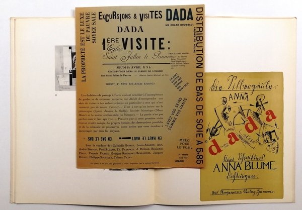 Cartellina (25x33) con fustellatura al piatto, quartini e fogli sciolti pubblicata in occasione dell'esposizione presso la Galerie Krugier e Cie di Ginevra. Con riproduzioni col. e b/n di opere di Marcel Duchamp, Max Ernst, Hans Arp, Kurt Schwitters, Francis Picabia, Man Ray, Jean Crotti, Hans Richter, Marcel Janco, Suzanne Duchamp. Fac-simile de l'affiche "Excursions e Visites DADA. 1ère visite: Saint Julien le Pauvre. Jeudi 14 Avril à 3 h. Ottimo stato