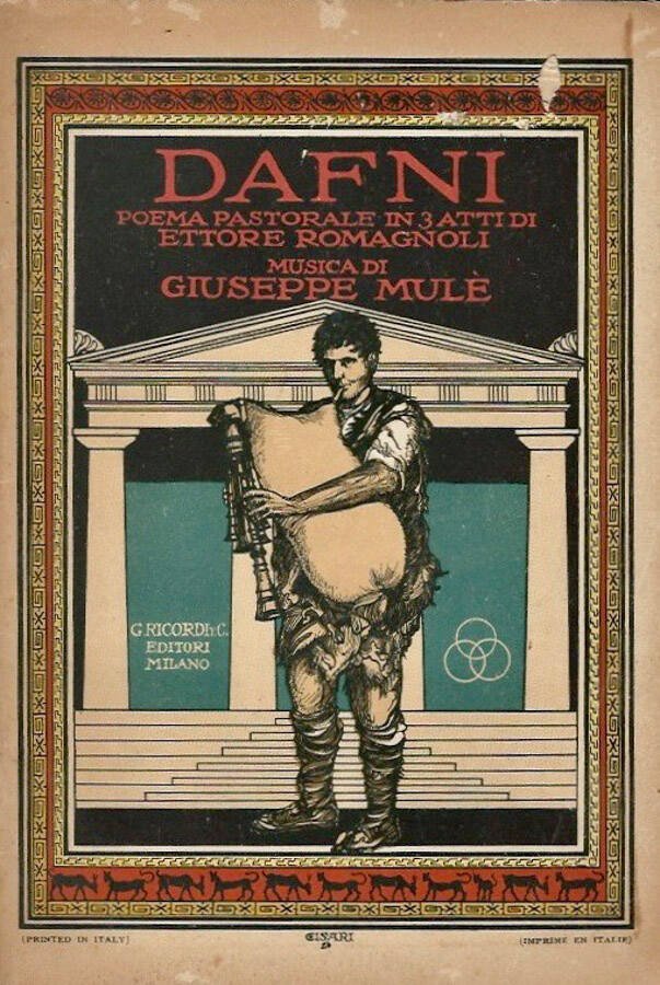 Fascicolo legato a punto metallico, libretto di poema pastorale in 3 atti, copertina illustrata in carta naturale, marginale la dissolvenza e velature di polvere, musica di G. Mulè, discrete le condizioni complessive. Numero Pagine 63