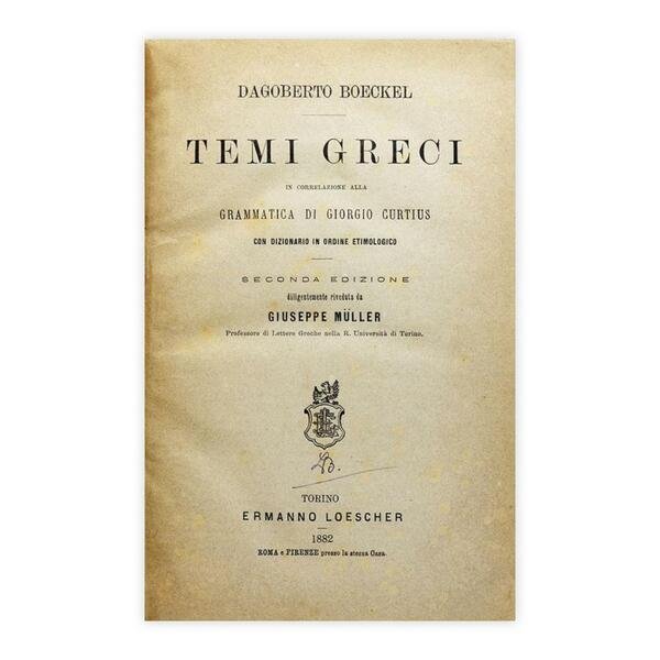 Autore: Dagoberto Boeckel Titolo: Temi Greci Sottotitolo: In correlazione alla grammatica di Giorgio Curtius con dizionario in ordine etimologico. Edizione: Ermanno Loescher - Torino 1882 Dimensioni: 13 x 20 cm c.a. Pagine: 207 Copertina: Cartonato Condizioni: Ottime come da foto