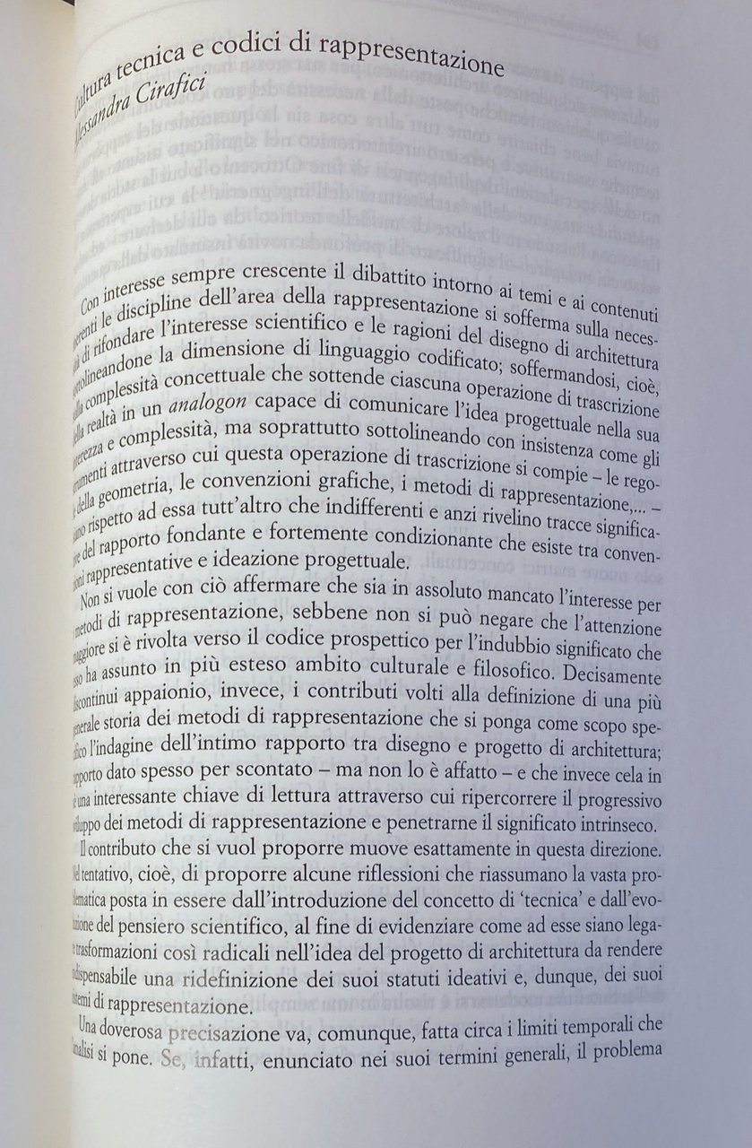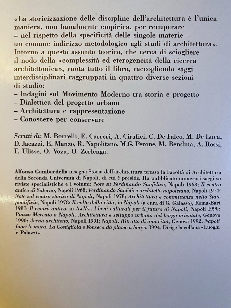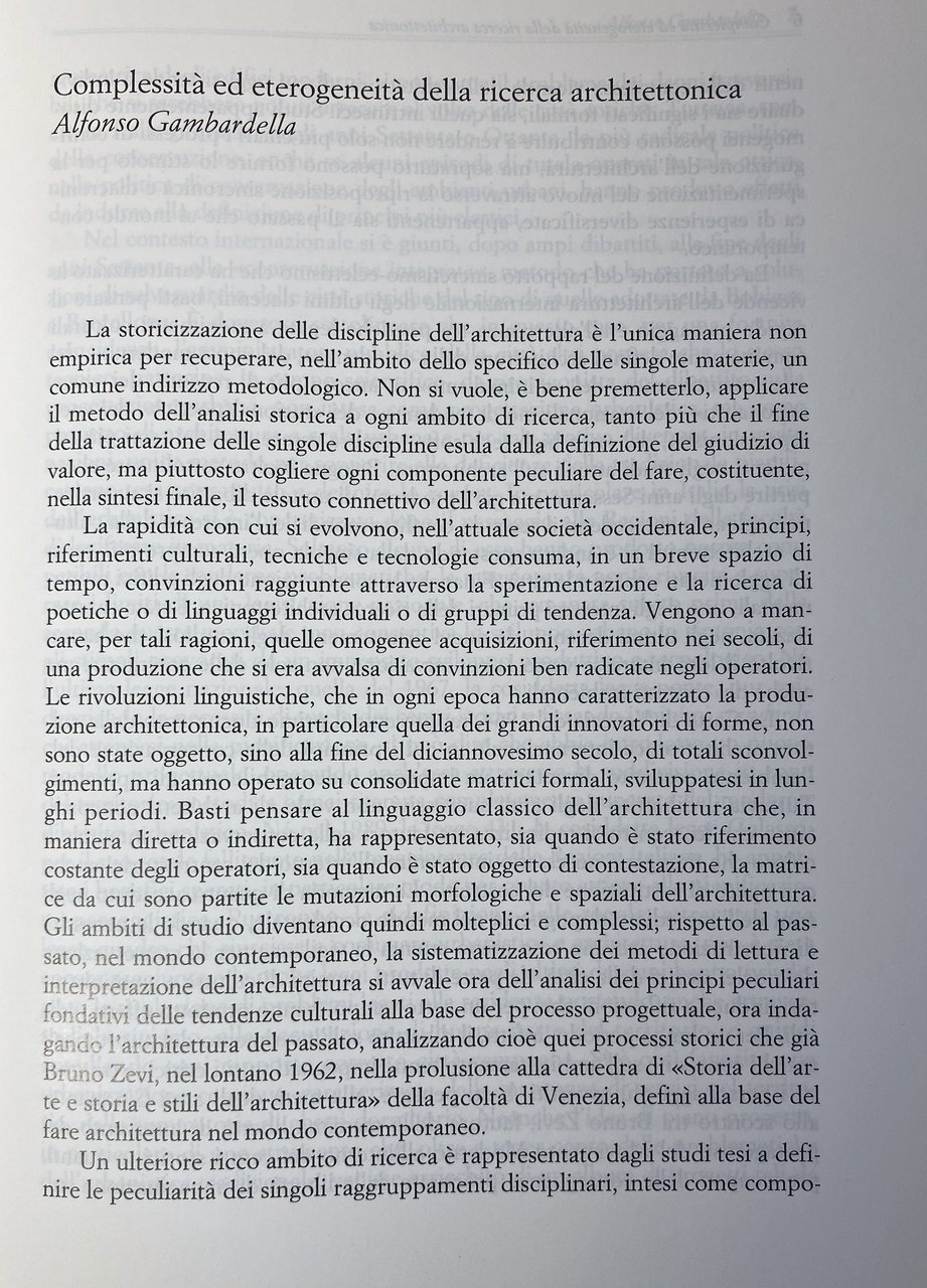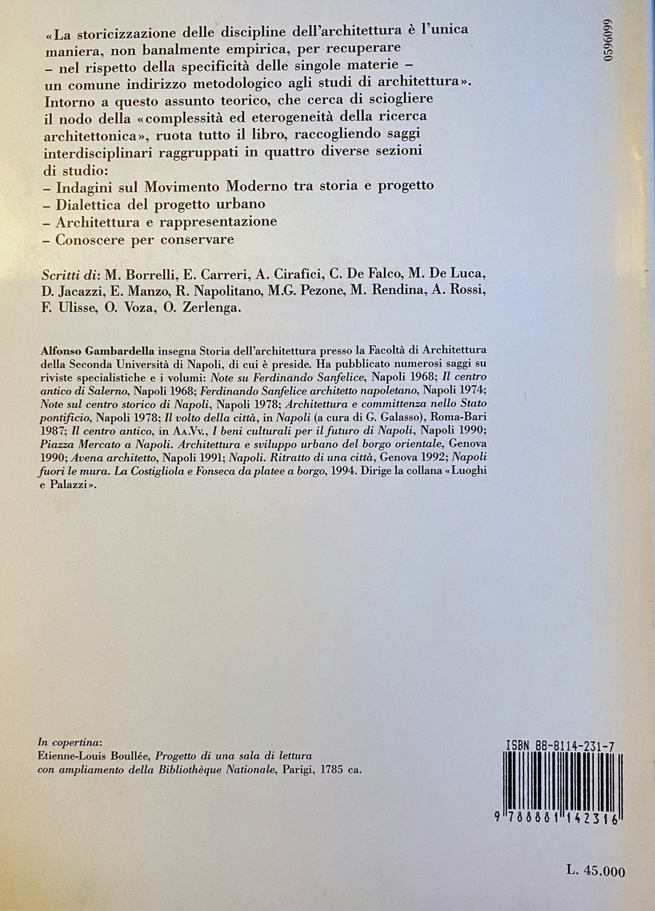 La storicizzazione delle discipline dell'architettura è l'unica maniera, non banalmente empirica, per recuperare, nel rispetto della specificità delle singole materie, un comune indirizzo metodologico agli studi di architettura. Intorno a questo assunto teorico, che cerca di sciogliere il nodo della complessità ed eterogeneità della ricerca architettonica, ruota tutto il libro, raccogliendo saggi interdisciplinari raggruppati in quattro diverse sezioni di studio: Indagini sul Movimento Moderno tra storia e progetto, Dialettica del progetto urbano, Architettura e rappresentazione, Conoscere per conservare.