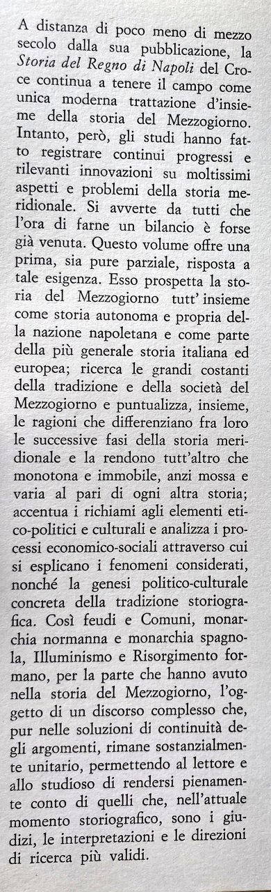 A distanza di poco meno di mezzo secolo dalla sua pubblicazione, la Storia del Regno di Napoli del Croce continua a tenere il campo come unica moderna trattazione d'insieme della storia del Mezzogiorno. Intanto, però, gli studi hanno fatto registrare continui progressi e rilevanti innovazioni su moltissimi aspetti e problemi della storia meridionale. Si avverte da tutti che l'ora di farne un bilancio è forse già venuta.
