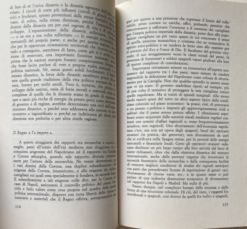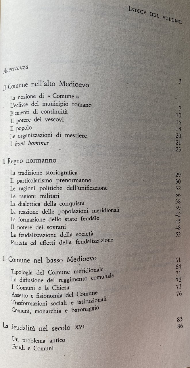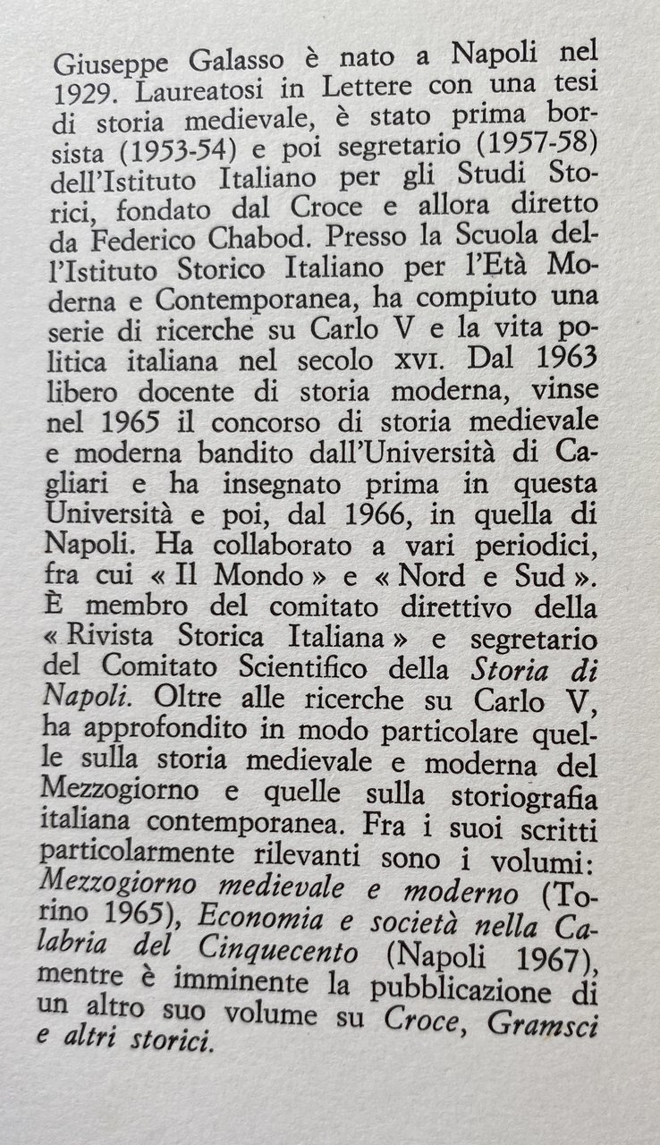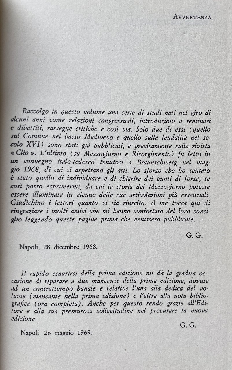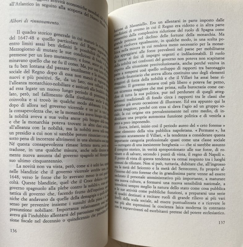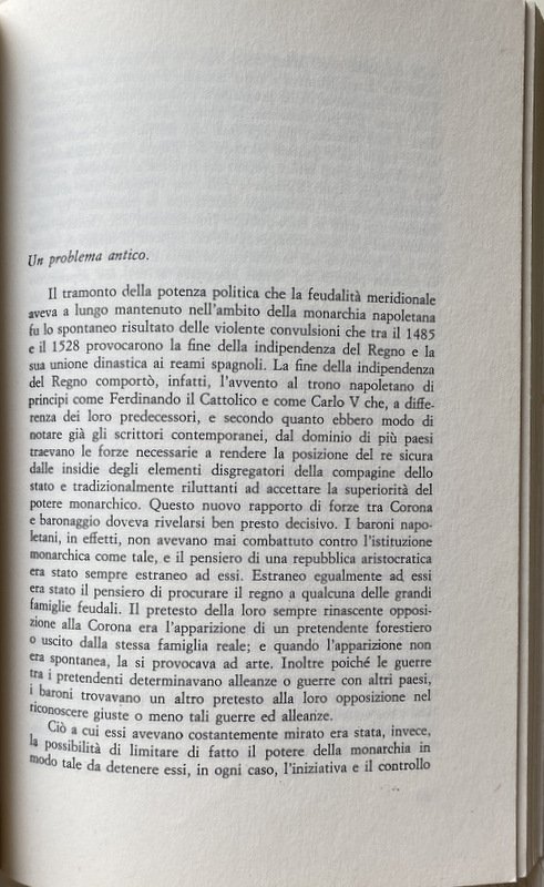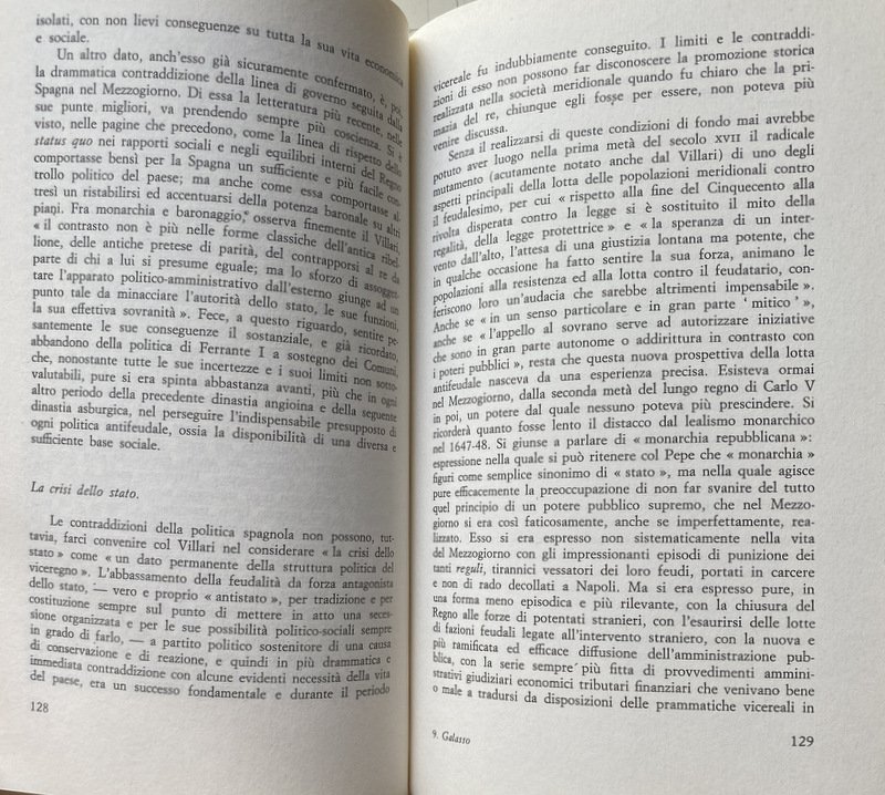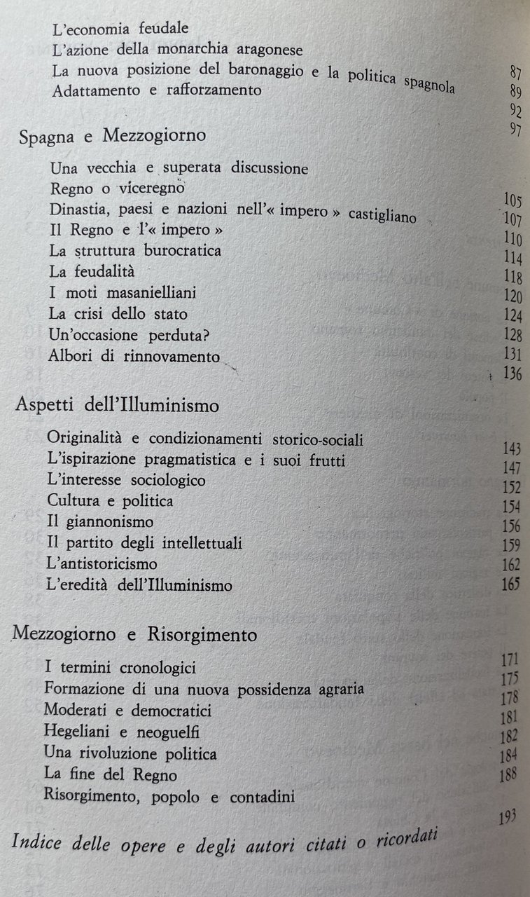 Soggetti: Storia moderna, Meridionalismo, Italia del Sud, Mezzogiorno, Regno di Napoli, Benedetto Croce, Cultura, Saggi storici, Studi culturali, Economia, Filosofia, Politica, Società, Medioevo, Modernità, Età contemporanea, Storiografia, Critica, Sviluppo economico, Feudalesimo, Illuminismo, Borghesia, Nobiltà, Aristocrazia, Proprietà, Terra di Lavoro, Agricoltura, Urbanesimo, Città, Reali, Spagna, Francia, Guerre, Rivolte, Rivoluzione francese, Monarchia, Popolo, Martiri rivoluzionari, Campania, Lucania, Basilicata, Puglia, Calabria, Sicilia, Molise, Angioini, Aragonesi, Borbone, Storicismo, Ideologie, Immobilismo, Clientelismo, Comuni, Feudi, Conquiste, Battaglie, Congiure, Congiura dei Baroni, Sovrani, Privilegi, Lotta di classe, Contadini, Campagna, Potere, Mestieri, Chiesa, Baronaggio, Baroni, Brigantaggio, Briganti, Camorra, Stato feudale, Viceregno, Comuni, Età comunale, Nord, Sud, Dinastie, Feudalità, Burocrazia, Crisi, Demografia, Industria, Manifatture, Tessile, Pietro Giannone, Giannonismo, Moti, Masaniello, Sociologia, Antistoricismo, Reazione, Hegeliani, Hegelismo, Idealismo, Cronologia, Possidenza agraria, Tasse, Neoguelfismo, Giustiniano, Università, Sacro romano Impero, Città Stato, Cesare Balbo, Repubblica, Venezia, Libertà, Corporazioni, Repubbliche marinare, Amalfi, Capua, Walter Goez, Oligarchia mercantile, Federico Ciccaglione, Francesco Calasso, Bizantino, Gaeta, Sorrento, Bisanzio, Fisco, Dazi, Dogana, Merci, Commercio, Banche, Credito, Usura, Ducati, Vescovi, Clero, Gerarchia Ecclesiastica, Ordini Monastici, Eredità, Benevento, Montecassino, Principi, Abbazie, Banno, Giurisdizione, Signorie, Monasteri, Beni ecclesiastici, Immunità, Patrimonio immobiliare, Donazioni, Artigianato, Associazioni, Boni homines, Giudici, Magistratura, Andrea Giardina, Burckhardt, Normanni, Autonomia, Diritto, Particolarismo, Salerno, Longobardi, Musulmani, Arabi, Islam, Infedeli, Cavalieri, Guerrieri, Vittorie, Battaglie, Guiscardo, Ruggiero, Corrado, Municipio, Dualismo, Rapporti sociali, Corona, Ferdinando il Cattolico, Proprietari fondiari, Regno di Napoli, Viceré, Amministrazione, Sudditi, Espansionismo, Dinastie, Controllo, Difesa, Castiglia, Dominio, Filippo II, Ernest Cassirer, Illuminismo napoletano, Ceto forense, Rinnovamento, Finanze, Crisi, Decadenza, Ferrante, Gabriele Pepe, Povertà, Ricchezza, Antonio Genovesi, Usi e costumi, Tradizioni, Gaetano Filangieri, Intellettuali, Cultura, Plebe, Gioacchino Murat, Luigi Blanch, Ennio Cortese, Adolfo Omodeo, Invasioni, Occupazione, Liberalismo, Massoneria, Logge massoniche, Giuseppe Mazzini, Garibaldi, Borboni, Conservatorismo, Rosario Villari, Rivolte, Repressione, Cavour, Piemonte, Rosario Romeo, Denis Mack Smith, Ruggero Moscati, Alfonso Scirocco, Passerin d'Entreves, Controrivoluzione, Mediterraneo, Riferimento, Bibliografia, Letteratura storica, Saggistica, Classici, Libri Vintage fuori catalogo, Federico Chabod, Riforma giudiziaria, Raffaele Ajello, Marc Bloch, Fernand Braudel, F. Carafa, Claude Cahen, Nino Cortese, Crociani, Vincenzo Cuoco, Cinquecento, Seicento, Settecento, Quattrocento, Età Medievale, Moderna, Pasquale Villani, Jaime Vicens Vives, Caravita, Santa Sede, Riforma agraria, Vaticano, Papato, Papa, Eleonora Pimentel Fonseca, Henri Pirenne, Michelangelo Schipa, Gramsci, Naples médiévale, Duché, Royaume, Cronache Meridionali, Giustino Fortunato, Gaetano Salvemini, Guido Dorso, Francesco Saverio Nitti, Questione meridionale, Unitarietà, Diversità, Governo, Regime delle terre, Volpe, Modern history, Southernism, Southern Italy, Kingdom of Naples, Culture, Historical essays, Cultural studies, Economy, Philosophy, Politics, Society, Middle Ages, Modernity, Contemporary age, Historiography, Criticism, Economic development, Feudalism, Enlightenment, Bourgeoisie, Nobility, Aristocracy, Property, Land of work, Agriculture, Urbanism, City, Royal, Spain, France, Wars, Revolts, French revolution, Monarchy, Plebs, Revolutionary martyrs, Sicily, Angevins, Aragonese, Bourbon, Historicism, Ideologies, Clientelism, Municipalities, Fiefdoms, Conquests, Battles, Conspiracies, Conspiracy of Barons, Sovereigns, Privileges, Class struggle, Peasants, Countryside, Power, Professions, Church, Baronage, Barons, Brigandage, Brigands, Feudal State, Viceroyalty, Municipalities, Communal Age, North, South, Dynasties, Feudalism, Bureaucracy, Crisis, Demography, Industry, Manufacturing, Textiles, Jannonism, Sociology, Antihistoricism, Reaction, Hegelians, Hegelianism, Idealism, Chronology, Agrarian Possession, Taxes, Neo-Guelphism, Justinian, University, Holy Roman Empire, City State, Republic, Venice, Liberty, Corporations, Maritime Republics, Mercantile Oligarchy, Byzantine, Byzantium, Taxation, Duties, Customs, Goods, Commerce, Banks, Credit, Usury, Duchies, Bishops, Clergy, Ecclesiastical Hierarchy, Monastic Orders, Inheritance, Princes, Abbeys, Ban, Jurisdiction, Lordships, Monasteries, Ecclesiastical Property, Immunity, Real Estate, Donations, Crafts, Associations, Judges, Judiciary, Normans, Autonomy, Law, Particularism, Longobards, Muslims, Arabs, Infidels, Crusades, Crociate, Knights, Warriors, Riots, Victories, Battles, Municipality, Dualism, Social relations, Crown, Ferdinand the Catholic, Landowners, Kingdom of Naples, Viceroy, Administration, Subjects, Expansionism, Dynasties, Control, Defense, Castile, Dominion, Philip II, Neapolitan Enlightenment, Legal class, Renewal, Finances, Crisis, Decadence, Ferrante, Poverty, Wealth, Traditions, Intellectuals, Culture, Invasions, Occupation, Liberalism, Freemasonry, Masonic Lodges, Bourbons, Conservatism, Revolts, Repression, Piedmont, Counter-revolution, Mediterranean, Reference, Bibliography, Historical literature, Non-fiction, Classics, Out-of-print books, Judicial reform, Sixteenth Century, Seventeenth Century, Eighteenth Century, Fourth Century, Medieval Modern Age, Holy See, Agrarian Reform, Vatican, Papacy, Pope, Southern Chronicles, Southern Question, Unitarity