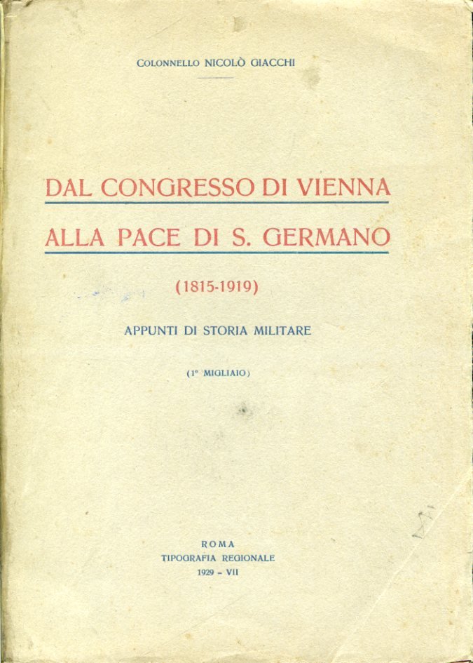 In-8°, pp. 299, brossura editoriale. Tabelle n.t. e f.t., di cui una più volte ripiegata sulle principali vicende organiche dell'esercito italiano durante la guerra. Una firma. Ottimo stato. Prima edizione, primo migliaio. Lo studio del colonnello Giacchi riguarda le vicende militari europee nel secolo che intercorre fra il 1815 e il 1919, con capitoli relativi anche ai conflitti combattuti dalle potenze europee in àmbito extraeuropeo (Guerra Anglo-Boera, Guerra Russo-Giapponese, guerre coloniali italiane in Libia e in Eritrea).