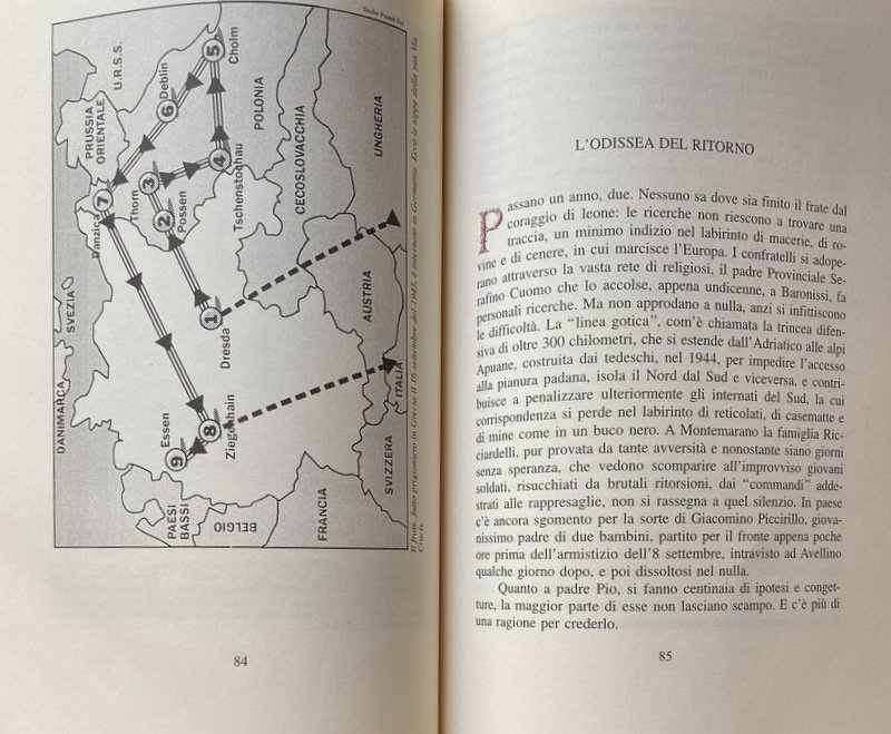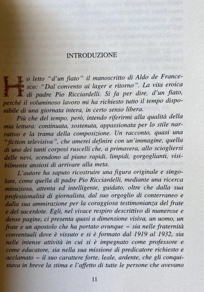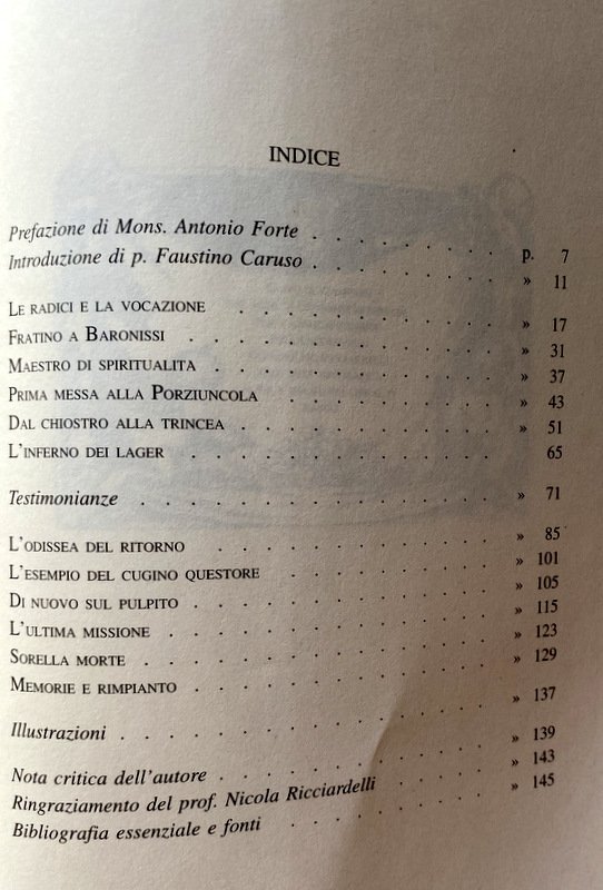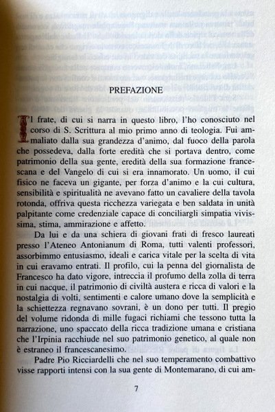 A cinquant'anni dalla morte del coraggioso e dinamico frate Pio Ricciardelli, questa rievocazione storico-documentaristica, arricchita da numerose e preziose foto d'epoca, rappresenta una insostituibile pista di indagine, per conoscere meglio e tramandare ai posteri la nobilissima figura del francescano montemaranese. La sua esistenza fu breve (nato nel 1908 a Montemarano, morì nel 1949), perché fu ghermito da un subdolo male, che lo portò alla tomba, quando era ancora pronto a donare alla collettività il prezioso contributo di amore, religiosità, di solidarietà, di cultura di quella testimonianza, che lo rese un francescano d'assalto per il suo ardore, per il suo carisma. Condusse con tenacia una lotta in favore di tali ideali superiori, i quali se da un versante lo riconducevano nell'alveo del disegno della Divina Provvidenza, dall'altro lo rendevano talmente presente nei suoi tempi, da farlo essere un costante punto di riferimento. Dall'altare, dalla cattedra, sul campo di battaglia testimoniò sempre e soprattutto una sconfinata fede in Dio ed un totale amore verso il prossimo. Quanti paesi attraversò come Cappellano militare in forza al XXVI Genio di Atene, allorché, consegnatosi ai Tedeschi, sperimentò insieme agli altri soldati la tristissima detenzione nei lager nazisti, ove la sua parola, il suo indomito esempio ed il suo coraggio arrecarono sollievo ai tanti internati da una dimensione umana degradante e rotta da sacrifici indicibili. E' qui che si erge a simbolo del fervore di una fede incrollabile la figura ieratica di Padre Pio Ricciardelli, il quale con opera infaticabile tenta in ogni maniera di raccordare l'uomo con Dio, unica ed ineliminabile possibilità di superare le afflizioni umane e gli atroci dolori materiali e morali, che incombevano sui prigionieri. Rientrato in Italia, riprese il suo ruolo di Apostolo del Vangelo. Non si contano le sue omelie, i suoi discorsi, i suoi incontri con intere comunità, durante i quali egli testimonia una vita intensa ed operosa sempre al servizio del Signore.