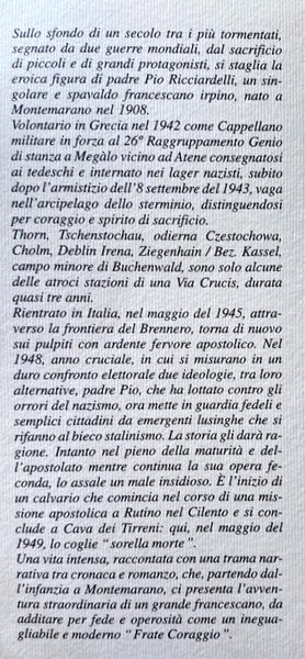 Sullo sfondo di un secolo tra i più tormentati, segnato da due guerre mondiali, dal sacrificio di piccoli e di grandi protagonisti, si staglia la eroica figura di padre Pio Ricciardelli, un singolare e spavaldo francescano irpino, nato a Montemarano nel 1908. Volontario in Grecia nel 1942 come Cappellano militare in forza al 26" Raggruppamento Genio di stanza a Megàlo vicino ad Atene consegnatosi ai tedeschi e internato nei lager nazisti, subito dopo l'armistizio dell'8 settembre del 1943, vaga nell'arcipelago dello sterminio, distinguendosi per coraggio e spirito di sacrificio. Thorn, Tschenstochau, odierna Czestochowa, Cholm, Deblin Irena, Ziegenhain / Bez, Kassel, campo minore di Buchenwald, sono solo alcun delle atroci stazioni di una Via Crucis, durata quasi tre anni. Rientrato in Italia, nel maggio del 1945, attraverso la frontiera del Brennero, torna di nuovo sui pulpiti con ardente fervore apostolico. Nel 1948, anno cruciale, in cui si misurano in un duro confronto elettorale due ideologie, tra loro alternative, padre Pio, che ha lottato contro gli orrori del nazismo, ora mette in guardia fedeli e semplici cittadini da emergenti lusinghe che si rifanno al bieco stalinismo. La storia gli darà ragione. Intanto nel pieno della maturità e dell'apostolato mentre continua la sua opera feconda, lo assale un male insidioso. E l'inizio di un calvario che comincia nel corso di una missione apostolica a Rutino nel Cilento e si conclude a Cava dei Tirreni: qui, nel maggio del 1949, lo coglie "sorella morte". Una vita intensa, raccontata con una trama narrativa tra cronaca e romanzo, che, partendo dall'infanzia a Montemarano, ci presenta l'avventura straordinaria di un grande francescano, da additare per fede e operosità come un ineguagliabile e moderno "Frate Coraggio".