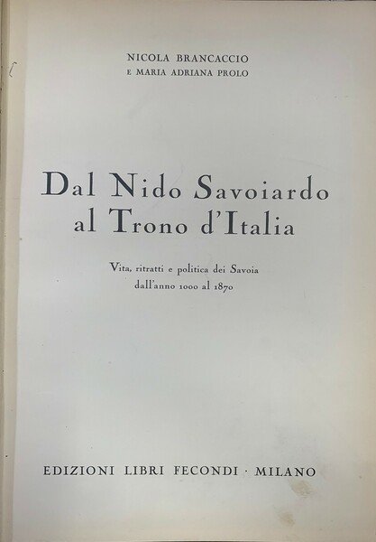 Vita, Ritratti e politica dei Savoia dall'anno 1000 al 1870. Milano. Edizioni Libri Fecondi 1930, in folio, pp. 20. Illustrato. Dorso leggermente stanco. Segni del tempo. Leg. Edit.