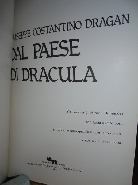 Giuseppe Costantino DREGAN. Dal paese di Dracula. Chi manca di spirito di humour non legga questo libro. Giuseppe Costantino DREGAN - Editrice Nagard, 1982. In-8°,tela rossa con titolo in oro sul dorso con sovracopertina, piccole macchioline grige nel retro della sovracopertina che presenta alcuni piccoli tagli, peraltro il libro è in ottimo stato di conservazione. 448 pp. con 10 illustrazioni in bianco e nero fuori testo. Neg. esot. mob. A.