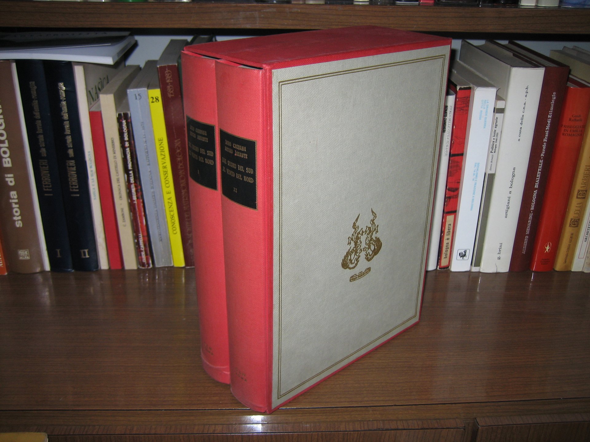 Due voll. In – 8vo grande, legatura editoriale con titoli in oro al piatto e al dorso, cofanetto in cartone rigido con impressioni in oro ai piatti, pp. 1436, XV ( numerazione continua ). Quinta edizione riveduta. Con numerose tavole fotografiche in nero nel testo. Ampia documentazione storica sugli ultimi due anni di guerra dell'Italia e sulla Repubblica Sociale Italiana.