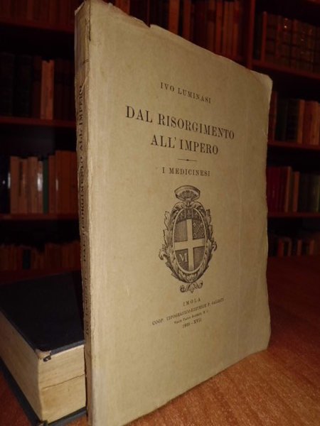 Ivo, Luminasi. Imola, Coop. Tip. - Editrice P. Galeati, 1939. Dal Risorgimento all' Impero. I MEDICINESI. A sua Eccellenza il Cavaliere medaglia d' oro Conte Costanzo Ciano di Cortellazzo Ammiraglio invitto eroe in guerra sagace ricostruttore in pace gloria dell' Italia fascista. In - 8°, br. orig. (4), 243, (2) pp. In buono stato di conservazione. Neg. Mob. 6.