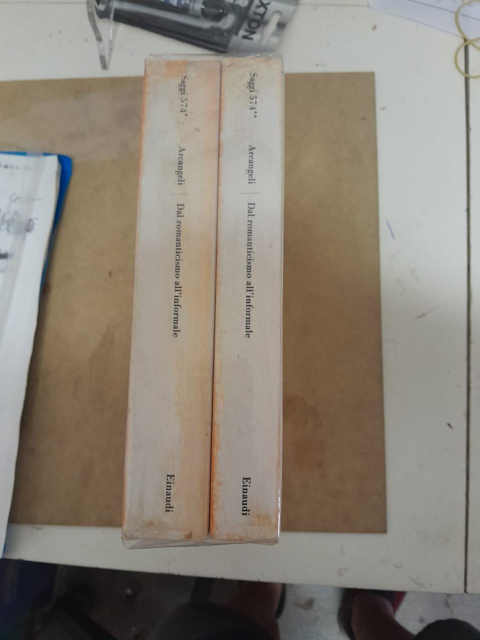Il dorso dei due volumi è solarizzato, cioè l'esposizione al sole dei dorsi ha parzialmente modificato il colore arancio tipico dei Saggi Einaudi.