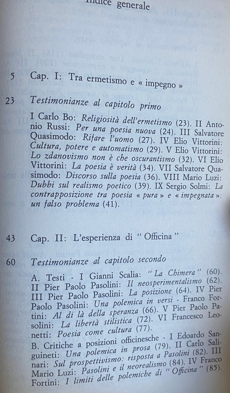 Soggetti: Letteratura italiana Novecento Gaetano Mariani Giorgio Petrocchi Storia Critica letteraria Movimenti artistici Ermetismo Impegno civile Intellettuali Correnti letterarie Avanguardia poetica Avanguardie artistiche Estetica Linguaggio Poesia Dopoguerra Società Incomunicabilità Liberazione Anni Quaranta Cinquanta Sessanta Settanta PCI Comunismo Sinistra Cultura decadente Decadentismo Gabriele D'Annunzio Psicologia Psicanalisi Freud Coscienza generazionale Antologie Falqui Antonielli Erba Chiara Realismo Fascismo Resistenza Guerra Lotte sociali Politica Elias Canetti Fronte Popolare Etica Morale Collettivismo Marxismo Franco Fortini Dieci inverni Edoardo Sanguineti Sperimentazione Roversi Romanò Rivoluzione Istituzioni Alternativa Pierpaolo Pasolini Controcultura Einaudiana Betocchi Mario Luzi Caproni Vittorio Sereni Libero Bigongiari Disimpegno Evasione Opere ermetiche Crepuscolarismo Guido Gozzano Lucini Vitalità Neoavanguardia Novissimi Originalità Officina Pascoli Borghesia Pirandello De Marchi Alfredo Giuliani Recensioni Giudizio Narrativa Testimonianze Carlo Bo Religiosità Antonio Russi Salvatore Quasimodo Elio Vittorini Potere Automatismo Zdanovismo Oscurantismo Verità Discorso Sergio Solmi Pura Impegnata Testi Gianni Scalia La Chimera Neosperimentalismo Polemiche Versi Libertà stilistica Francesco Leonetti Critiche Posizioni Polemica Prosa Salinari Prospettivismo Risposta Neorealismo Limiti Analisi Nando Balestrini Opposizione Fausto Curi Lettura Porta Pagliarani Funzione Lingua Luciano Anceschi Fenomenologia Renato Barilli Angelo Guglielmi Gruppo 63 Storica Autonomia relazionale Arte Università Demagogia Ferdinando Camon Ideologie Museo Capitalismo Quindici Riviste Poeti maledetti II Walter Siti Totale Lamberto Pignotti Comunicazione di massa Arrigo Lora Totino Sandro De Alexandris Ricerca sperimentale grafica pubblicitaria Battisti Visiva Gillo Dorfles Tradizionale Milli Graffi Luoghi Simbolismo Voce Adriano Spatola Concetto Ermanno Migliorini Consumismo Luigi Baldacci Poetiche Creazione Eugenio Montale Andrea Zanzotto Bibliografia Riferimento Collezionismo Libri rari Vintage fuor catalogo Saggistica Studi culturali Italianistica Bachtin Caffè Cassola Benedetto Croce Gatto Gadda De Sanctis Gramsci Jakobson Joyce Lukacs Marinetti Marcuse Moravia Ezra Pound Politecnico Ori Palazzeschi Pasternak Fernanda Pivano Kafka Rimbaud Quaderni rossi Piacentini Ungaretti Sapegno Stalin Americana Italo Svevo Palmiro Togliatti Tzara Verri Artistica Storiche Borghese Ceneri Confronti Contemporanea Ermetica Feltrinelli Idee Laborintus Marxista Sonora Radicale Rivoluzionaria Scrittori Sessantotto Sociologia Stile Surrealismo Anticonformismo Zeno Manacorda Raboni Kemeny Italian literature Twentieth century History Literary criticism Artistic movements Hermeticism Civil commitment Intellectuals Currents Poetic Avant-gardes Aesthetics Language Poetry Post-war Society Incommunicability Liberation Communism Left Decadent culture Decadentism Psychology Psychoanalysis Generational consciousness Anthologies Realism Fascism Resistance War Social struggles Politics Popular Front Ethics Collectivism Marxism Ten winters Experimentation Revolution Institutions Alternative Counterculture Disengagement Escape Hermetic works Crepuscularism Workshop Bourgeoisie Reviews Judgment Narrative Religiosity Power Automatism Obscurantism Truth Discourse Texts Polemics Verses Stylistic freedom Criticisms Prose Perspectivism Response Neorealism Analysis Opposition Reading Function Phenomenology Group Relational autonomy Art University Demagogy Ideologies Museum Capitalism Magazines Poets Mass Communication Experimental Research Advertising Graphics Traditional Places Symbolism Concept Consumerism Creation Bibliography Reference Collectibles Rare Books Out of Print Non-Fiction Cultural Studies Historical Bourgeois Comparisons Contemporary Marxist Radical Revolutionary Writers Sociology Style Surrealism Non-Conformism