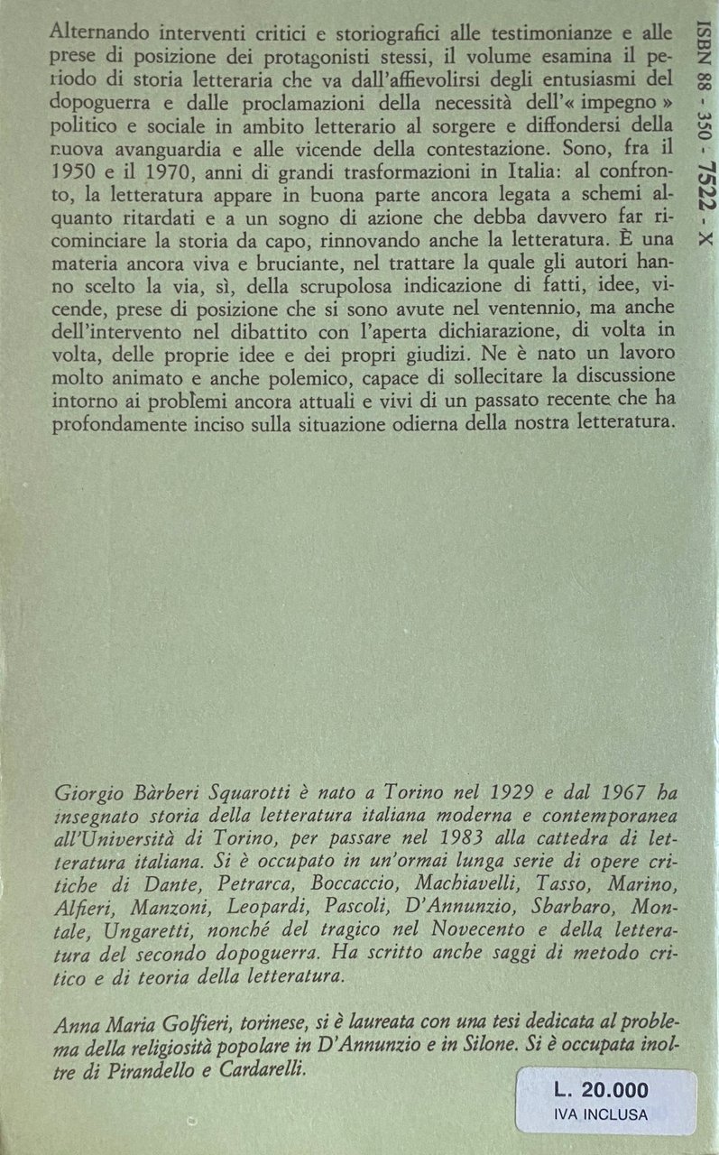 Alternando interventi critici e storiografici alle testimonianze e alle prese di posizione dei protagonisti stessi, il volume esamina il periodo di storia letteraria che va dall'affievolirsi degli entusiasmi del dopoguerra e dalle proclamazioni della necessità dell'impegno politico e sociale in ambito letterario al sorgere e diffondersi della nuova avanguardia e alle vicende della contestazione. Sono, fra il 1950 e il 1970, anni di grandi trasformazioni in Italia: al confronto, la letteratura appare in buona parte ancora legata a schemi alquanto ritardati e a un sogno di azione che debba davvero far ricominciare la storia da capo, rinnovando anche la letteratura. È una materia ancora viva e bruciante, nel trattare la quale gli autori hanno scelto la via, sì, della scrupolosa indicazione di fatti, idee, vicende, prese di posizione che si sono avute nel ventennio, ma anche dell'intervento nel dibattito con l'aperta dichiarazione, di volta in volta, delle proprie idee e dei propri giudizi. Ne è nato un lavoro molto animato e anche polemico, capace di sollecitare la discussione intorno ai problemi ancora attuali e vivi di un passato recente che ha profondamente inciso sulla situazione odierna della nostra letteratura.
