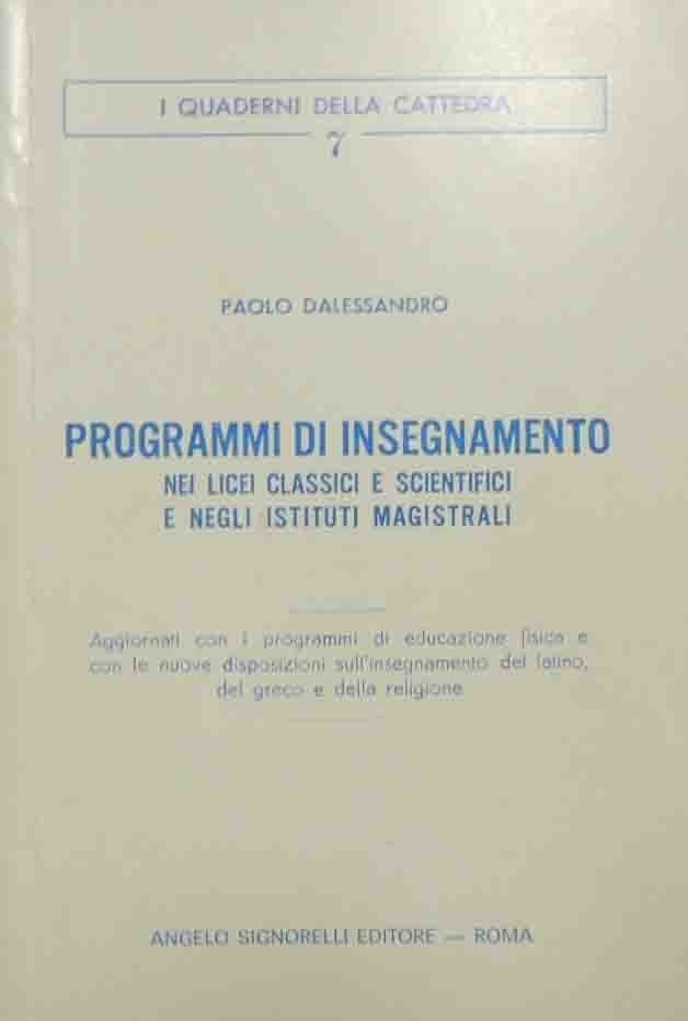 Paolo Dalessandro, Programmi d’insegnamento nei licei classici e scientifici e negli istituti magistrali. Aggiornati con i programmi di educazione fisica e con le disposizioni sull’insegnamento del latino, del greco e della religione, Angelo Signorelli Editore, Roma 1968, pp. 128, cm 20, br. ed. Collana I quaderni della cattedra, n. 7. Piccolo timbro di appartenenza al frontespizio. Perfetto.