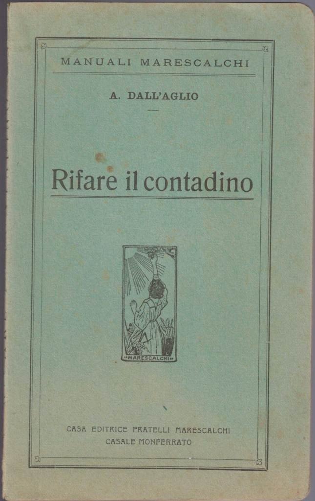 A. Dall’Aglio, Rifare il contadino, Casa Editrice Fratelli Marescalchi, Casale Monferrato 1927, pp. 64, cm 19, br. ed. Collana Manuali Marescalchi, n. 82. Volumetto sulle condizioni economiche e sociali dei lavoratori agricoli nei primi decenni del XX secolo in Italia. Indice: Prefazione degli Editori – Premessa – Chi è il contadino? – Condizioni economiche e fatica muscolare in campagna – Pregiudizi intorno al mestiere – L’istruzione nelle campagne – Pregiudizi da vincere nel campo dell’istruzione – Condizioni dell’insegnamento elementare nelle Scuole serali – Bisogni intellettuali del contadino – Provvedimenti immediati. Qualche sporadica traccia di lapis a margine, per il resto perfetto. Non comune.