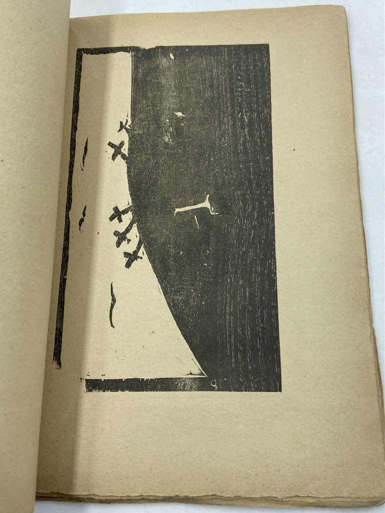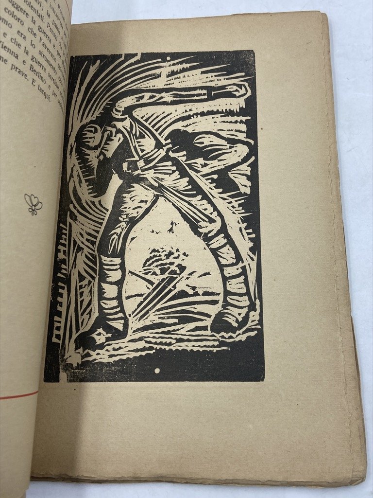 Brossura editoriale illustrata, cm 25.5 x 18, pp XII 111 (1), testo riquadrato in rosso, 12 xilografie di Lorenzo Viani a piena pagina, incluso il frontespizio. Contenuti professionali restauri sulla brossura, margini talvolta irregolari per l’apertura col tagliacarte, buon esemplare nel complesso. Diario di guerra e prigionia dell’ufficiale Marino Ferretti, edizione originale pubblicata in 1000 esemplari a beneficio dell’Associazione Nazionale fra Mutilati e Invalidi di guerra, Sezione di Bagni di Montecatini; il racconto prende le mosse ai primi di giugno del 1917, a San Giovanni di Duino, e prosegue attraverso Prosecco, Lubiana, Sigmundsherberg, Mauthausen sul Danubio fino al Ritorno in dicembre. In apertura, lettere di Virgilio Bondois e Emilio Sottini. L’opera fu illustrata da Lorenzo Viani (Viareggio 1882 - Lido di Ostia 1936), anch’egli reduce di guerra (s’era arruolato volontario nel 1916), e in quel periodo (1920-1923) residente a Montecatini dove la moglie Giulia Giorgetti era maestra elementare; legato a Ferretti da una devota amicizia, Viani realizzò le tavole e gli affidò i legni, che furono conservati dalla famiglia e mai reimpressi (Cardellini-Signorini, p. 253). Le immagini che accompagnano il racconto con sintetico tratto espressionista raffigurano soldati italiani e austriaci, trincee, prigionieri e sepolture con grande efficacia drammatica e costituiscono «la più bella serie di xilografie di guerra del Viani» (Fini, p. 29). Bibliografia: Ida Cardellini-Signorini, Lorenzo Viani; Rodolfo Fini, Lorenzo Viani xilografo, 157-168).