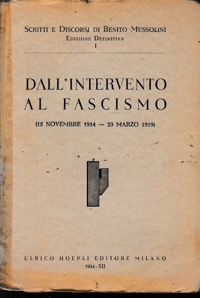 Bross. editoriale con alette in-8°(cm 22x15,5), pp. 381., titolo nero al dorso. Ritratto fotografico di Mussolini in antiporta protetto da velina. Buone condizioni. Scritti e discorsi di Benito Mussolini. Edizione definitiva I.