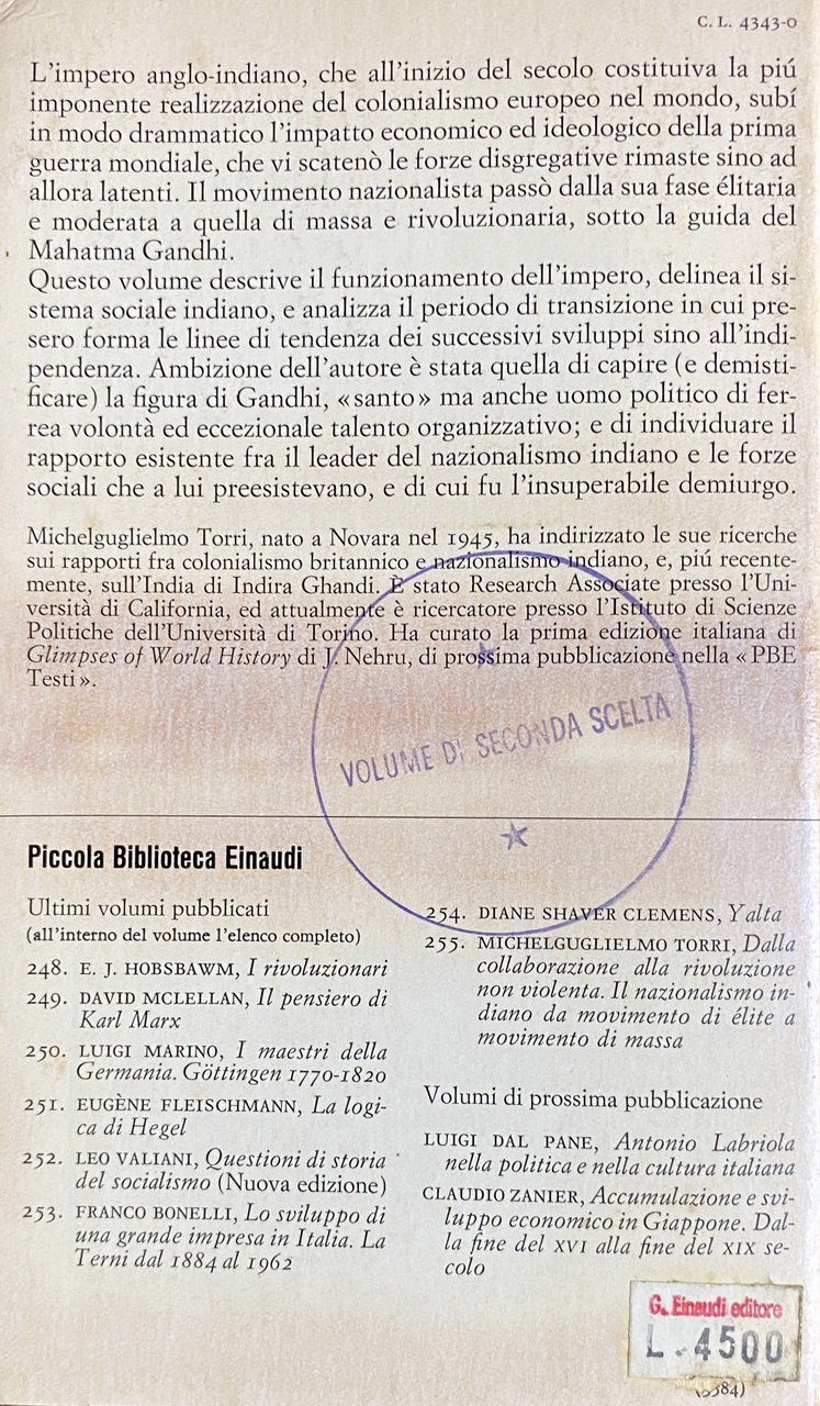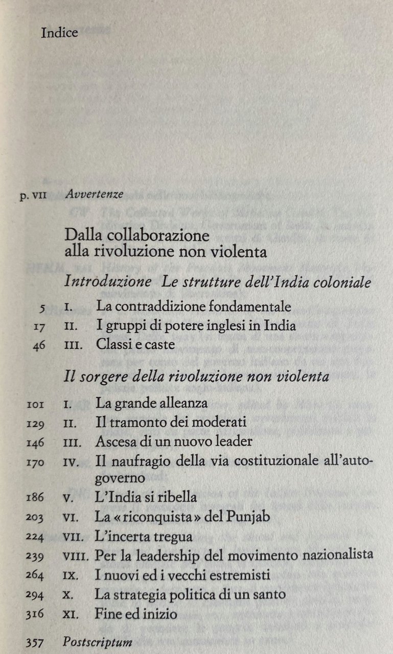 Soggetti: Storia contemporanea Colonialismo inglese Impero britannico Imperialismo Nazionalismo-indiano India Scienze Politiche Colonialismo Colonizzazione Politica estera Colonie Asia Guerre Indipendenza Economia Sfruttamento Libertà Lotta Non-violenza Movimenti politici Rivoluzione Classi sociali Caste Punjab Gruppi di potere Ribellione Rivolte Leader Alleanze Democrazia Suffragio Costituzione Autogoverno Bibliografia Riferimento Saggi Libri fuori catalogo Mahatma Congresso Nazionale Raj Ettore Passerin D'Entrèves Giorgio Borsa Enrica Collotti Pischel Commercio Spezie Materie prime Compagnia delle Indie Orientali Navigazione Età Vittoriana Corona Britannica Sepoys Rivolta Feudalesimo Maharatta Bengali Storiografia Ahmedabad Home Rule Amritsar Bal Gangadhar Tilak Surendranath Banerjee Bengalese Besant Bombay Borghesia Brahmani Burocrazia Calcutta Chelmsford Classe media Committee Comunità Covenanted Disobbedienza civile DWARKADAS Estremisti Europei Dyer Governo Gruppi Guerra Gujarat Gujarati League Indigeni Indù Influenti Jawaharlal Nehru Jinnah KANJI Khilafat Lega musulmana Legge Rowlatt Lokamanya London Lotta Madras Maggioranza Maharashtra Malaviya Masse Membri Moderati Mont-ford Non-cooperazione Nazionalista Mozione Musulmani Nagpur Organizzazione Politica Popolazione Presidenza Province Unite Questione Riforme Satyagraha Sir Michael Sistema Statement 1919 Sub-continente University Vicerè XIX secolo Young Notabili Intellettuali Povertà Analfabetismo Industria Santoni Carestie Vacche sacre Mylaporei Scuola Cambridge Seal Harold Stuart Società Teosofica South Subhas Chandra Bose Tomlinson Uomini politici Veda Vertici Working Committee Mobilitazione David Washbrook Rise Judith Brown Misre Lingue Masters Suez Buddismo Induismo Sikh Jainismo Zoroastrismo Ulema Minoranze Dacoit Percival Griffiths Edwin Montagu Islam Immobilismo Lewa Patidar Kaira Ideologie Contemporary history British colonialism British Empire Imperialism Indian nationalism India Political Science Colonialism Colonization Foreign policy Colonies Wars Independence Economy Exploitation Freedom Struggle Non-violence Political movements Revolution Social classes Castes Power groups Rebellion Revolts Alliances Democracy Suffrage Constitution Self-government Bibliography Reference Essays Out of print books National Congress Trade Spices Raw materials East India Company Navigation Victorian Age British Crown Revolt Feudalism Historiography Bourgeoisie Bureaucracy Middle class Committee Community Civil disobedience Extremists Europeans Government Groups War Indigenous Hindus Influential Muslim League Law Struggle Majority Masses Members Moderates Non-cooperation Nationalist Motion Muslims Nagpur Organization Politics Population Presidency United Provinces Question Reforms System Sub-continent Viceroy 19th century Notables Intellectuals Poverty Illiteracy Industry Holy men Famine Sacred cows School Theosophical Society Politicians Summits Mobilization Brahmins Languages Buddhism Hinduism Zoroastrianism Minorities Immobility Ideologies