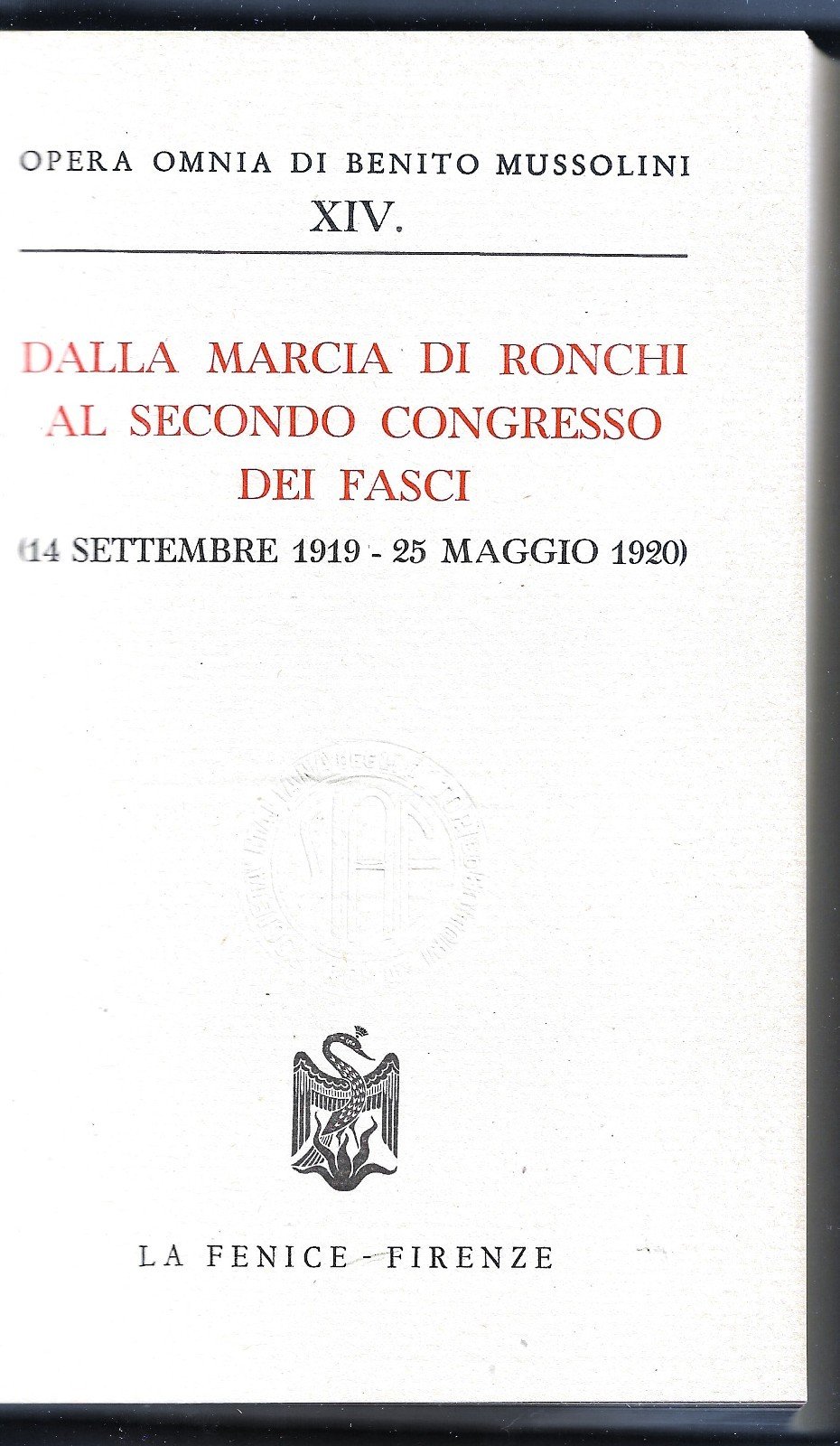 Libro vintage in-8°, cartonata di pagg 531, Firenze 1954. Storia, collana Opera Omnia di Benito Mussolini XIV. Fregio a sbalzo in copertina, Ingiallimento interno, legatura semi licenziata.