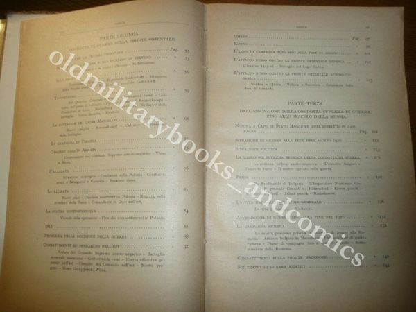 DESCRIZIONE: Stabilimento Poligrafico per l'Amministrazione dello Stato Roma 1923 Ministero dello Guerra Stato Maggiore Ufficio Storico br. ed. pp. 304 con 6 cartine n.t. e 2 ill., 3 carte ripieg. fine vol. in 8°. Figura importante della WWI, esercitò il comando supremo dell'esercito tedesco sul fronte orientale, ottenendo notevoli vittorie contro i russi. Dal 1916, promosso feldmaresciallo, assunse la guida militare di tutte le forze del Reich, dirigendo, in collaborazione con il suo abile capo di Stato Maggiore generale Erich Ludendorff, lo sforzo bellico tedesco fino alla fine della guerra nel novembre 1918. Godendo di grande fama e prestigio presso il popolo tedesco anche dopo la sconfitta, fu Reichspräsident della Repubblica di Weimar dal 1925 al 1934, anno della sua morte. Durante il suo secondo mandato presidenziale assistette agli eventi che condussero alla nascita del Terzo Reich hitleriano e in parte li avallò. CONDIZIONI: Accettabili/Discrete dorso mancante, cop. staccata. PESO / WEIGHT: 720 gr. without package
