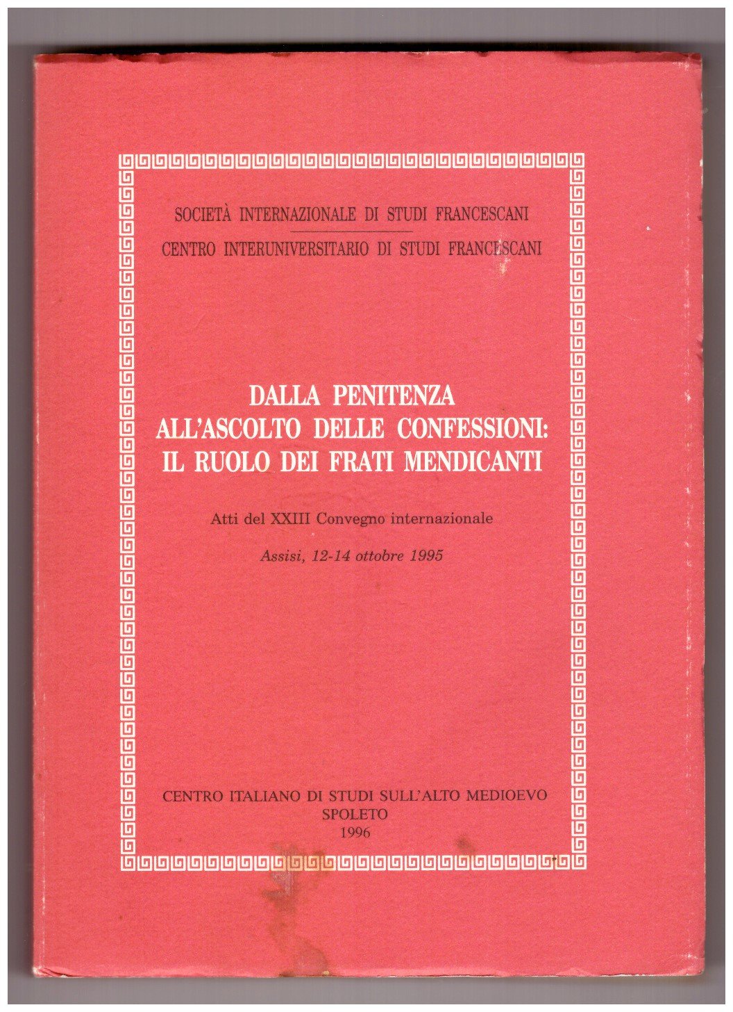 Atti del XXIII Convegno internazionale, Assisi 12-14 ottobre 1995. Un volume (24 cm) di X-321 pagine, con XX tavole fuori testo. A fogli ancora chiusi. Una firma di possesso alla pagina di occhiello. Brossura editoriale con titolo alla copertina, nella Nuova serie degli Atti del Convegno della Società internazionale di studi francescani e del Centro interuniversitario di studi francescani (5). Una macchia bruna alla copertina, peraltro ottime condizioni.