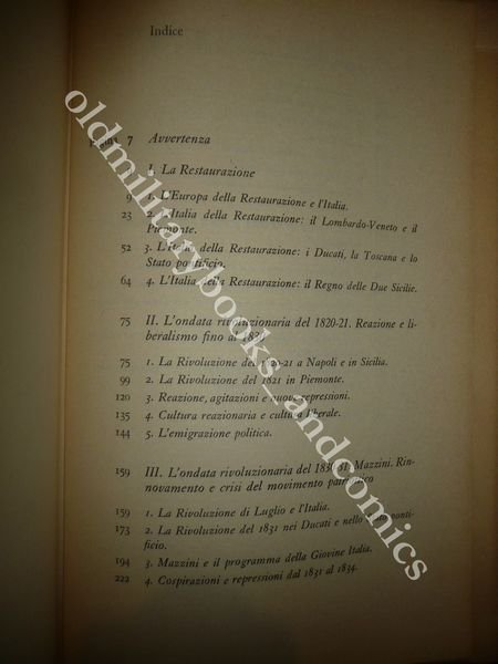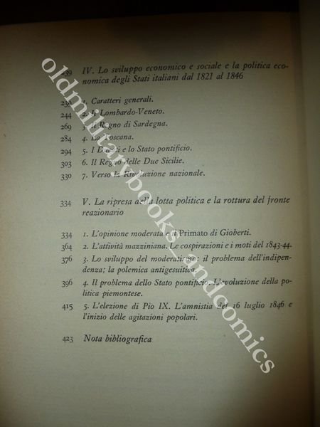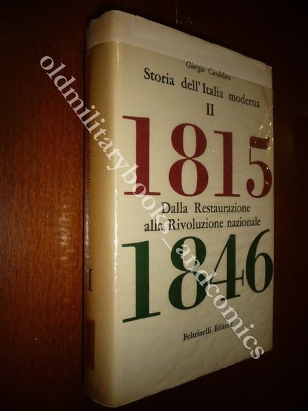 DESCRIZIONE: Feltrinelli Editore Milano 1958 I^ Ed., br. ed. t.t. con sovracc. con alette con acetato di protezione, pp. 457 in 8°. Secondo vol. della serie. La Restaurazione, l'ondata rivoluzionaria 1820-21, l'ondata rivoluzionaria 1830-31, lo sviluppo economico e sociale e la politica economica degli stati italiani dal 1821 al 1846, la ripresa della lotta politica e la rottura del fronte reazionario. CONDIZIONI: Ottime. Il vecchio proprietario, un matematico, era stato Preside di Liceo, e Docente Universitario. Questo libro proviene dalla sua importante biblioteca privata, per cui alla prima bianca sono riportati i codici di catalogazione oltre all’etichetta sul dorso. PESO / WEIGHT: 674 gr. without package