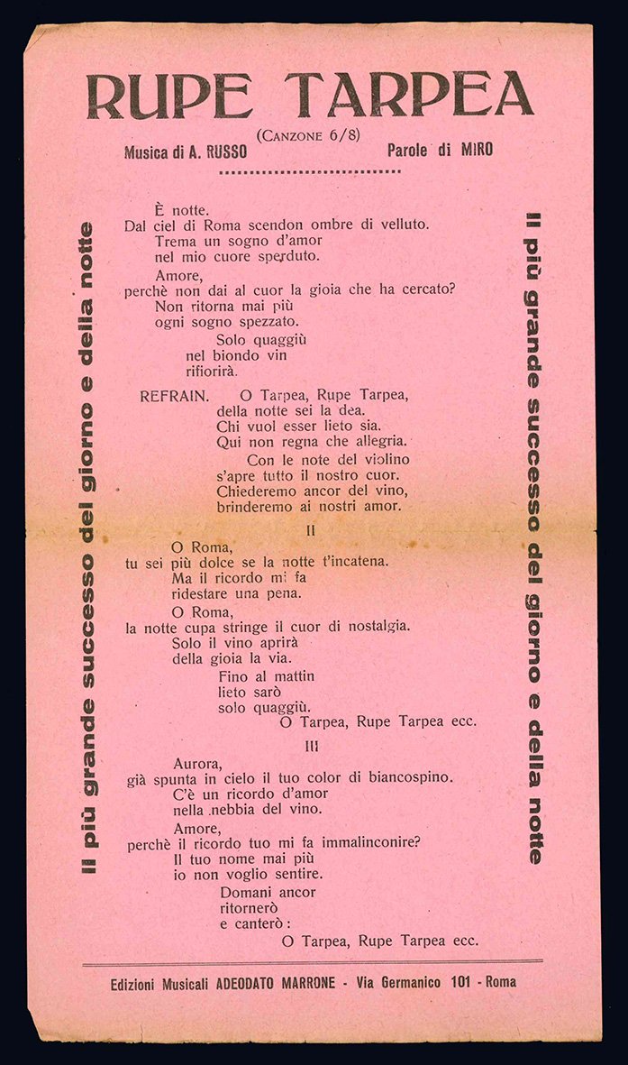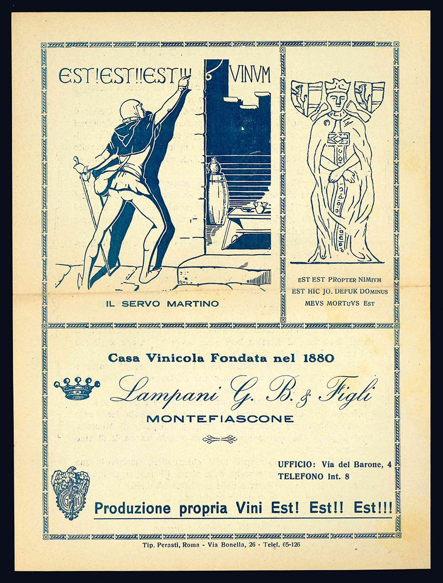 Il patron Luigi Falcioni "memore della tradizione dell'antica Enotria" serviva i vini più rinomati del Lazio. (si unisce:) 1 volantino pubblicitario illustrato del celebre Est! Est! Est! di mm 210x158; 1 foglietto volante su carta rosa di mm 250x140 con il testo della Canzone: Rupe Tarpea, musica di A. Russo e parole di Miro.