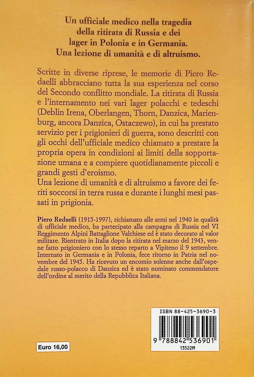Editore: Ugo Mursia Editore Collana: Testimonianze fra cronaca e storia Data di Pubblicazione: 2006 EAN: 9788842536901 ISBN: 8842536903 Pagine: 147 Argomenti: Autobiografie: personaggi storici, politici e militari, MEDICINA GENERALE Condizioni: più che buone 2H-3-4 Scritte in diverse riprese, le memorie di Piero Redaelli abbracciano tutta la sua esperienza nel corso del secondo conflitto mondiale. La ritirata di Russia e l'internamento nei vari lager polacchi e tedeschi (Deblin Irena, Oberlangen, Thorn, Danzica, Marienburg, ancora Danzica, Ostaczewo), in cui ha prestato servizio per i prigionieri di guerra, sono descritti con gli occhi dell'ufficiale medico chiamato a prestare la propria opera in condizioni ai limiti della sopportazione umana e a compiere quotidianamente piccoli e grandi gesti d'eroismo. Una lezione di umanità e di altruismo a favore dei feriti soccorsi in terra russa e durante i lunghi mesi passati in prigionia.