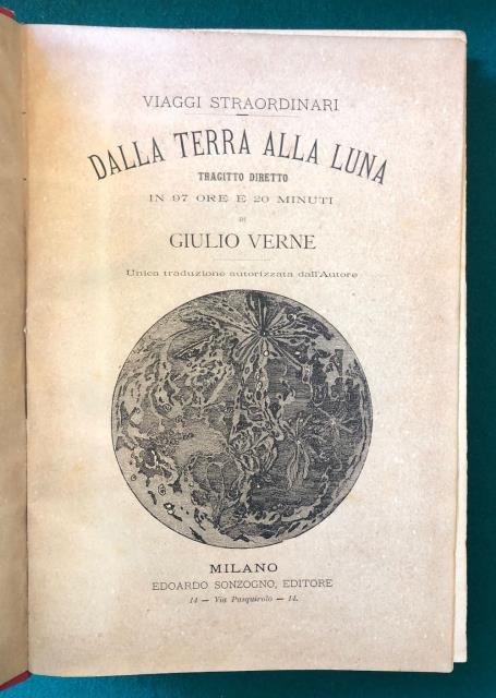 Edoardo Sonzogno Editore, Milano, 1887. Collana “Viaggi Straordinari”. Unica traduzione autorizzata dall'Autore. In 8vo grande, tre racconti uniti: pp. 169 (con Indice); 179 (con Indice); 219 (non presenta Indice). Moltissime, grandi e belle le incisioni in b/n n. t., che illustrano i racconti con un sapore ancora tutto ottocentesco, leg. coeva ma non orig. in tutta percallina rossa (non conservata la bross. orig.). Uniformemente ingiallito (un po' più scuri il primo e l'ultimo foglio bianchi), molto buono l'interno. .
