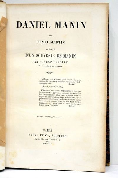 Daniel Manin. Précédé d'un souvenir de Manin, par Ernest Legouvé, de l'Académie Française.