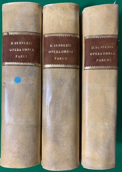 <BR>In folio; tre tomi: (44), 572, (12), 150, 118, (6), (6), 97, (5) pp. una tavola a piena pagina conm alambicchi chimici a pagina 499; (34), 900, (12) pp.; (12), 626, (4), 248, (6), (2 b.) pp. (una tavola a piena pagina in numerazione). Legature novecentesche in mezza pergamena con titolo impresso in oro su fascette in pelle al dorso. Piatti foderati con carta marmorizzata coeva. Un leggerissimo alone all'angolo basso della prima parte del primo volume, del tutto ininfluente, un piccolissimo lavoro di tarlo al margine esterno bianco delle prime due carte (anticamente integrato con una pecetta al recto), ininfluente. Marca tipografica ai frontespizi entro cornice ornamentale, raffigurante un ippogrifo poggiato su un libro chiuso che sormonta un piccolo globo terrestre, con il motto "Sic mihi atque aliis". Nel complesso esemplare in buone-ottime condizioni di conservazione. Prima edizione completa delle opere del celebre medico e naturalista tedesco, Daniel Sennert (Breslavia 1572 - Wittenberg 1637). Nato a Breslavia, all'epoca parte della monarchia asburgica, fu professore all'Università di Wittenberg ed è celebre per la sua teoria degli "atoma corpuscula" seconda la quale ogni corpo rappresenta il risultato dell'aggregazione di molecole costituite da atomi originari, tanto da essere considerato come uno dei primi ad intuire le basi della teoria atomica. Nello specifico, forma un ponte intermedio tra le opere di Geber e i corpuscularisti più conosciuti come Robert Boyle che sembra che da Sennert, mutuò alcune idee sperimentali. Le teorie di Sennert erano basate su prove esperienziali e sperimentali che aveva raccolto sia dai resoconti dei testimoni oculari che dalla sua esperienza di laboratorio. Oltre a dare uno dei primi resoconti sulla scarlattina, Sennert ha dato un notevole contributo anche conoscenza dello scorbuto, della dissenteria e dell'alcolismo. Pur essendo un abile medico fu un credente assertore della veridicità della stregoneria. Seppur nei primi anni di insegnamento si rifece alle teorie aristoteliche, si avvicinò ben presto alle teorie alchemiche arrivando ad abbracciare le teorie della trasmutazione alchemica, già intorno al 1610. A Wittenberg fu per sei volte eletto preside di facoltà e le sue opere chimiche ed alchemiche ebbero numerose ristampe. Morì nel 1641 a Wittenberg durante la violenta epidemia di peste che colpì la città. Rif. Bibl.: Garrison, 61, in riferimento all'edizione lionese del 1676, "Besides giving one of the earliest accounts of scarlatina, Sennert added to the knowledge of curvy, dysentery and alcoholism. He was an able clinician, but a believer in witchcraft. "His "Opera" was firstly published in 1641"; Krivatsy, 10908; Hirsch, V, 230.